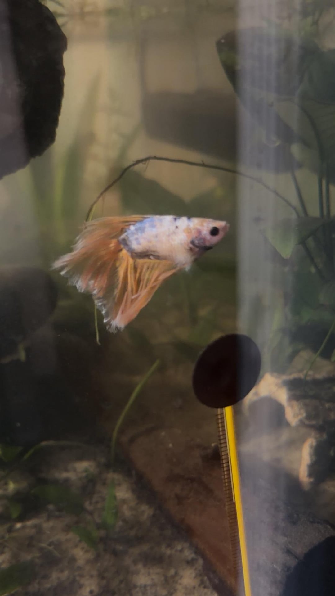 I’ve had Bali for quite some time now. I got him with severe fin rot, frail, and pale. He’s been thriving since giving him a proper home, but now he’s oddly fat. I fasted for 3 days, and just gave him a quick ten minute epsom salt bath today. Haven’t tested water parameters yet, just did my weekly water change today (20-30% depending on how I’m feeling). These pictures were right after my water change, with the lights off so I promise my water isn’t *that* dirty. Little brown diatom algae issue per usual. Nothing else has really been abnormal, but do you think this can get better? Any other input would be appreciated.