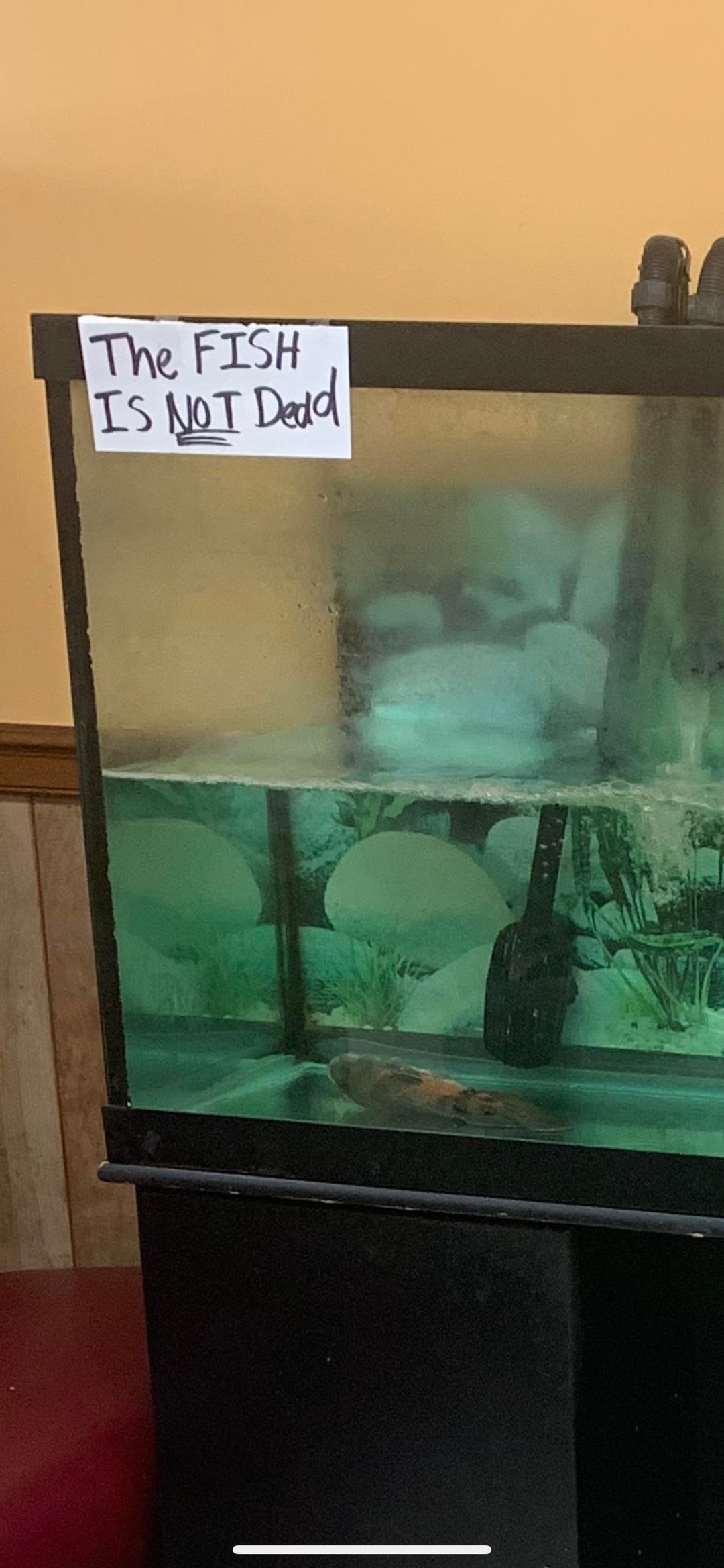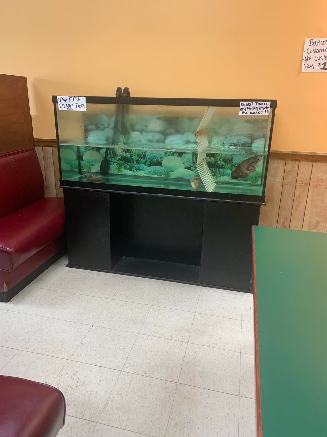 1. The poor fish. At that point, to have such a bare tank, and a low water level, why even bother having an aquarium in a restaurant.