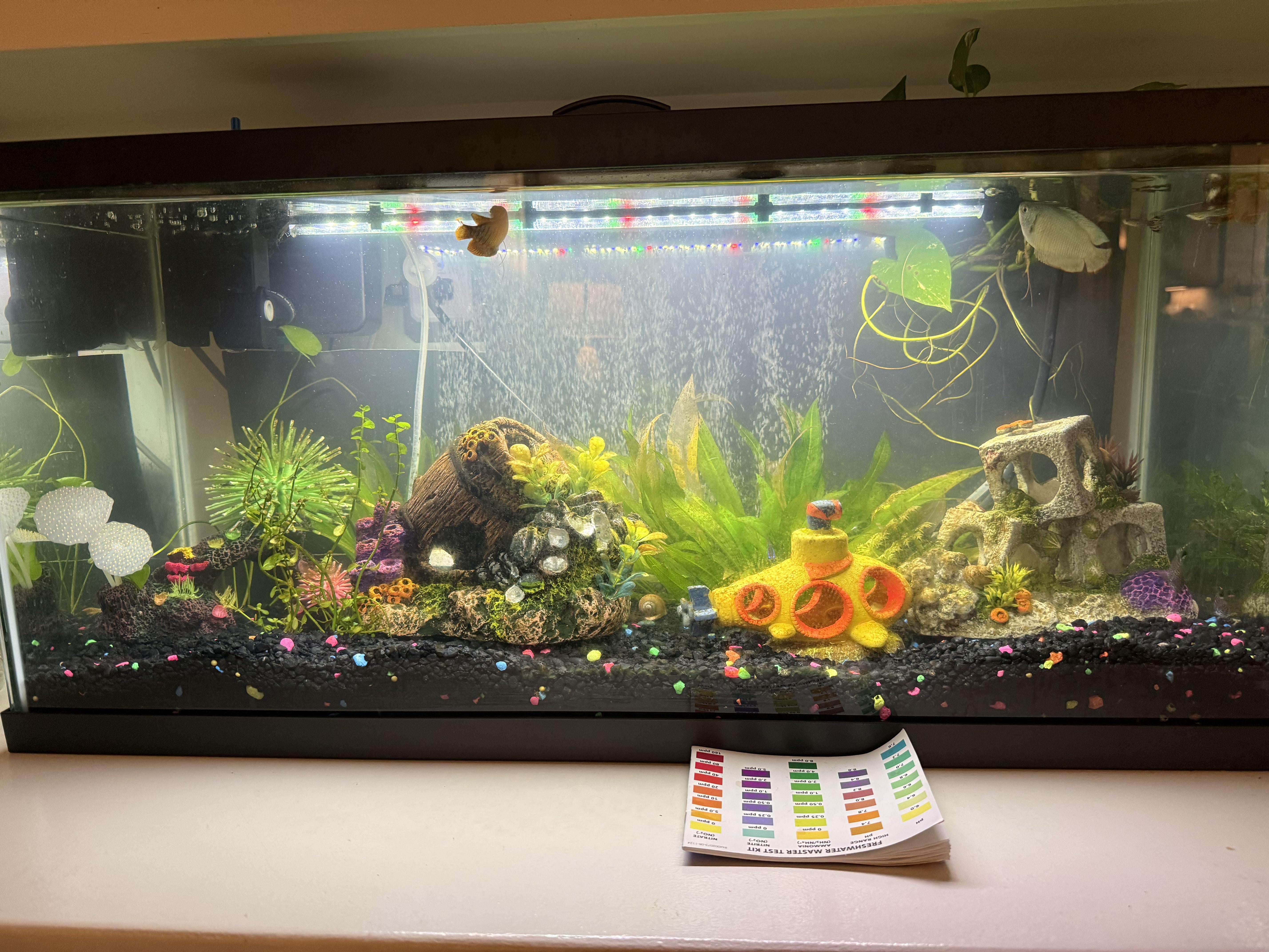 I’m removing the decor and adding more plants while I’m doing the water change. Then I’ll fill it back up, dechlorinate it and let it warm up before adding the gouramis back tomorrow. I’ll keep testing until my ammonia is back to 0 before I get anymore fish.