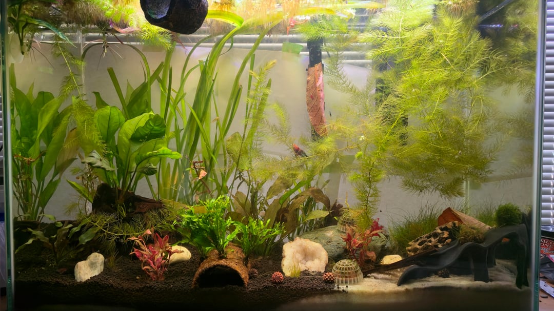 I have taped white paper to the back and sides of the tank to help mitigate the issue, but it hasn't really helped. I have the light set at 50% thinking it might be too bright, but I don't want to go too low and discourage plant growth. There are about 40 to 50 neocaridina shrimp, 2 ghost shrimp, and 6 kuhli loaches, and a nice colony of random snails in the tank. Nemo and his tankmates pretty much ignore each other and go about doing their own things. The other tankmates show no signs of stress or odd behavior. I've only had one death. A ghost shrimp died after molting. All of my other shrimp molt just fine and I find molts almost daily. Three of my shrimp are berried and one of my Kuhlis has eggs!