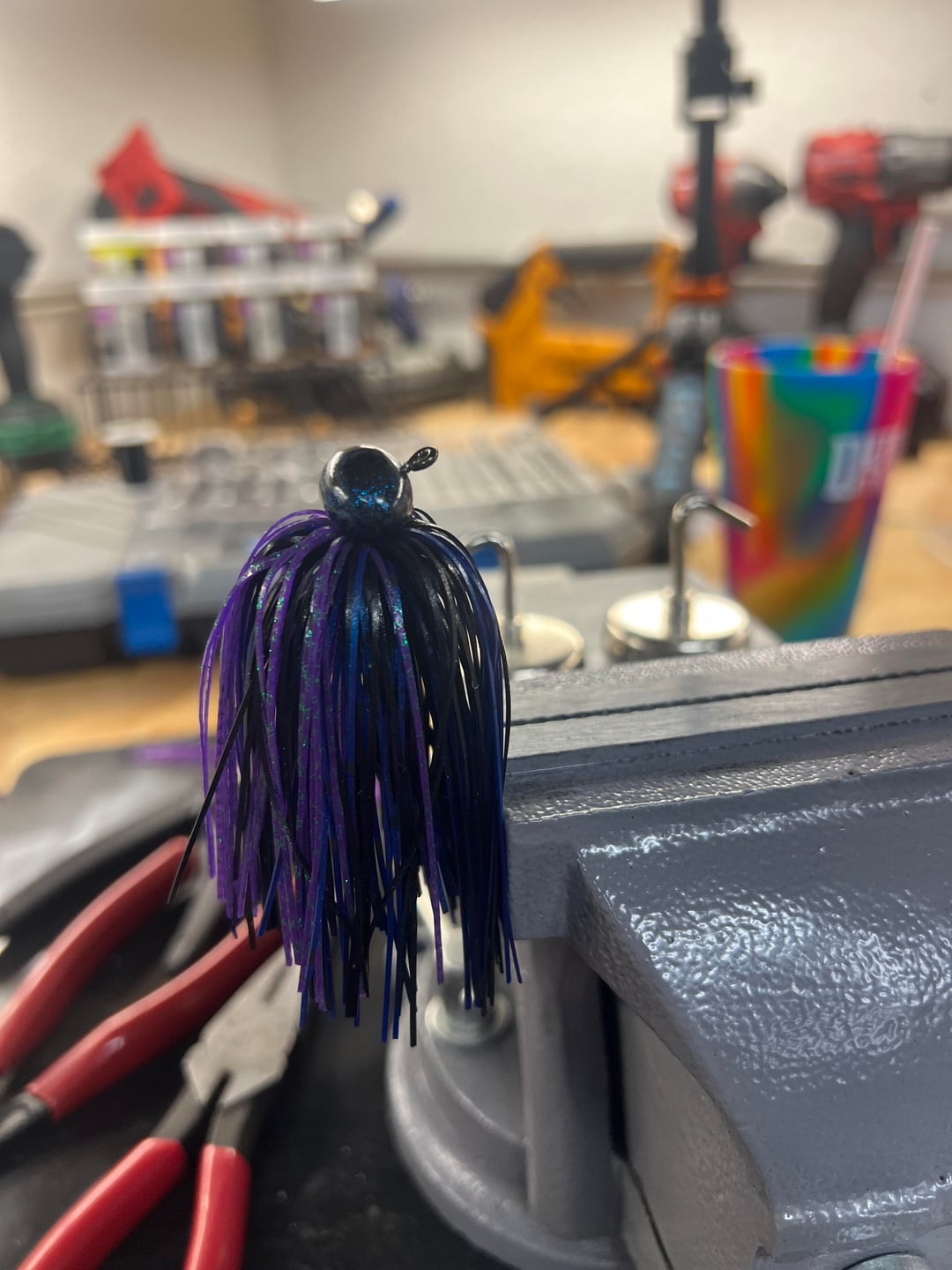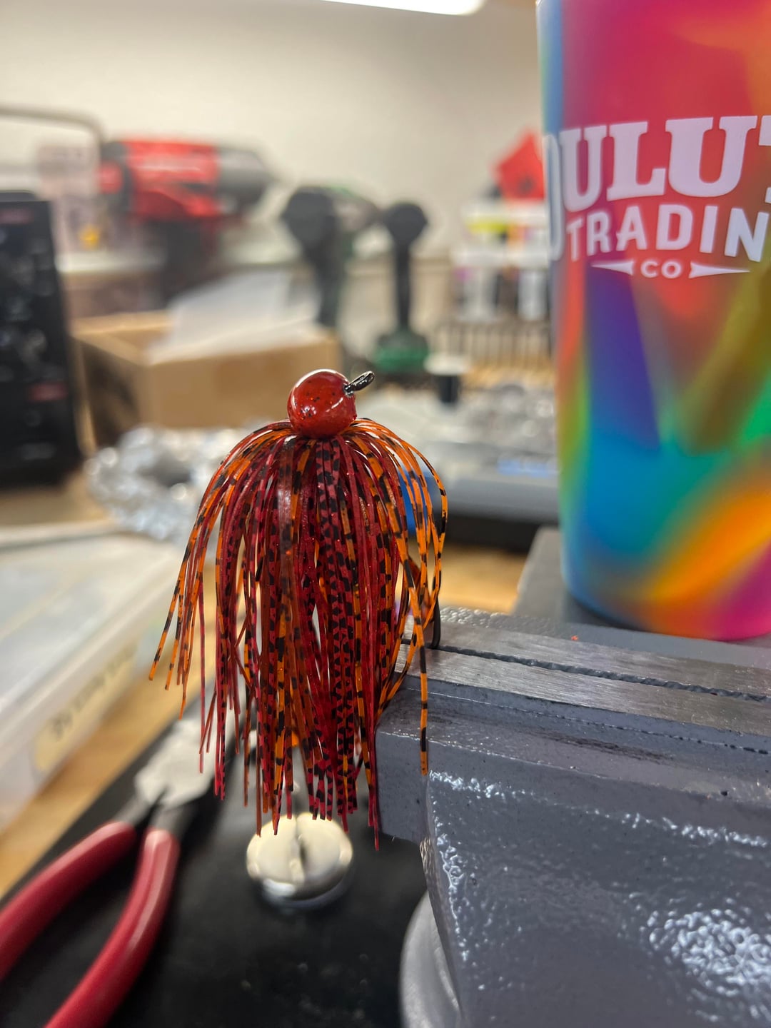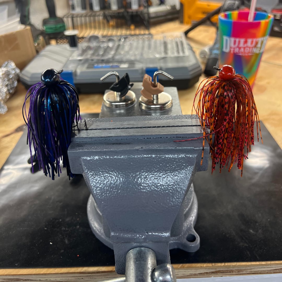 Snuck out to the garage to tie a couple football jigs this evening. What y’all think, black/purple or fire craw? I’m really liking them both.