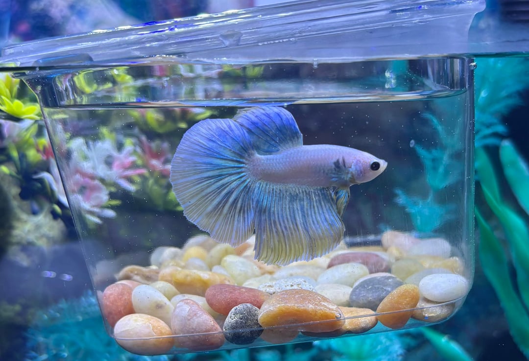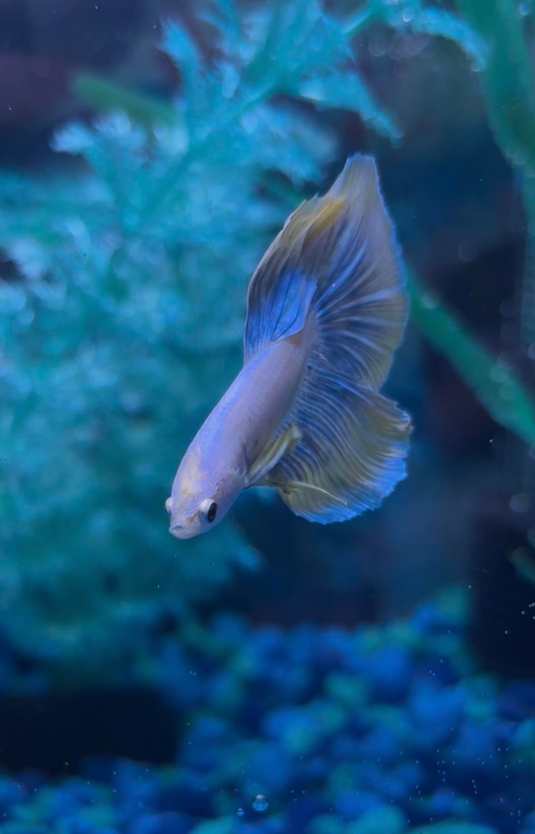 I'm looking for names for this gorgeous boy! He came to me a pale white with partially clear fins, and I'm so happy to see he has brightened into a lovely ivory, yellow, and blue.