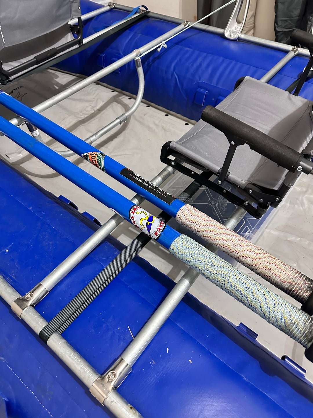 Problem #3: The oar towers stay in place correctly, however the side rails that they sit on, will spin slightly when rowing, causing them to “fall”. A simple bit of para-cord tied to the bottom of the oar lock and then back to the frame fixed this issue. It keeps them from being able to bow outwards.