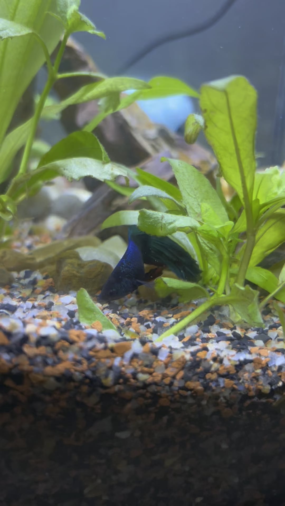 He’s exploring the tank, resting on plants, and interacting a lot with his surroundings.