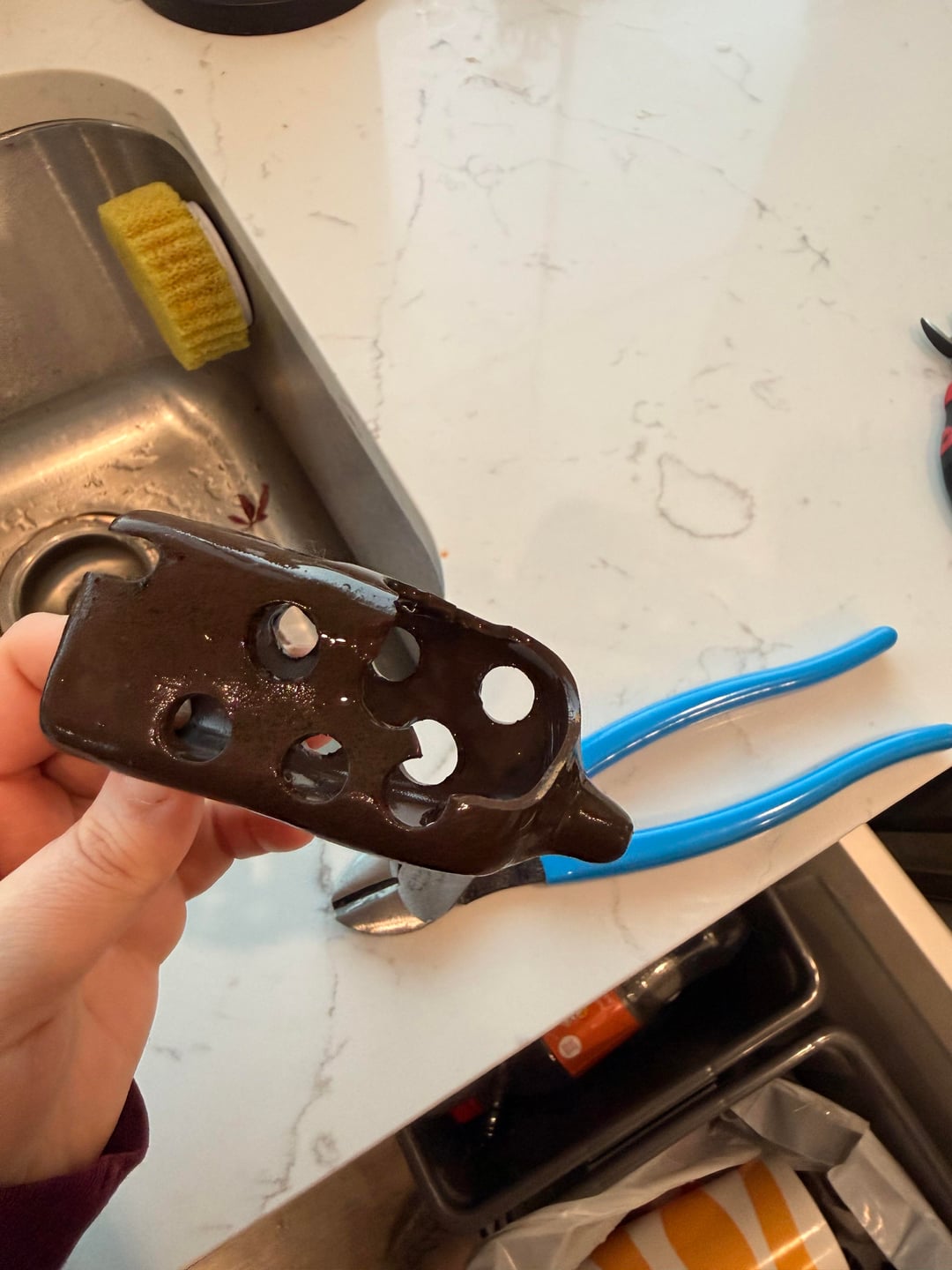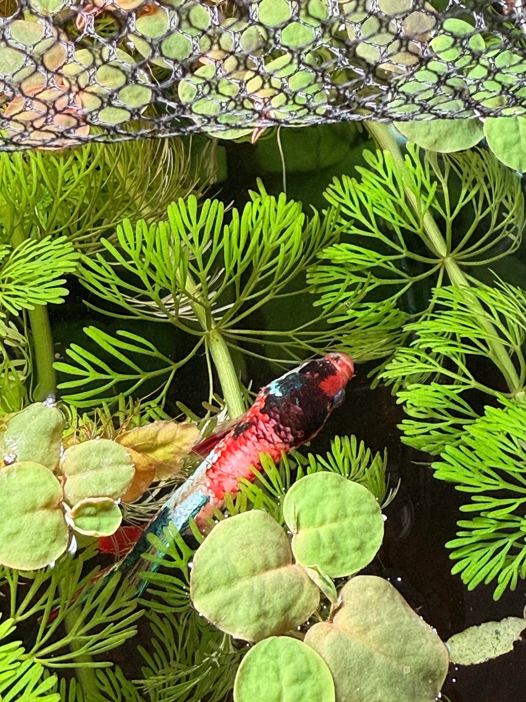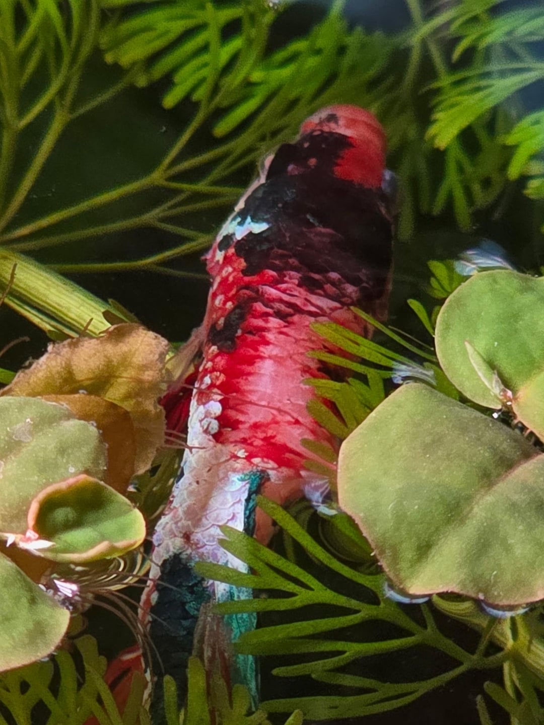 Between my husband and I, we couldn’t find Jalapeño all day but just chalked it up to it being a very heavy planted tank and he’s just sharking around but then my husband found him. He somehow got himself in the shrimp house and stuck in a hole and we had to cut it off of him. He isn’t doing well, he looks rough. We have a catappa leaf in there with low flow, dimmed lights, co2 off, checked water and it’s still good parameters.