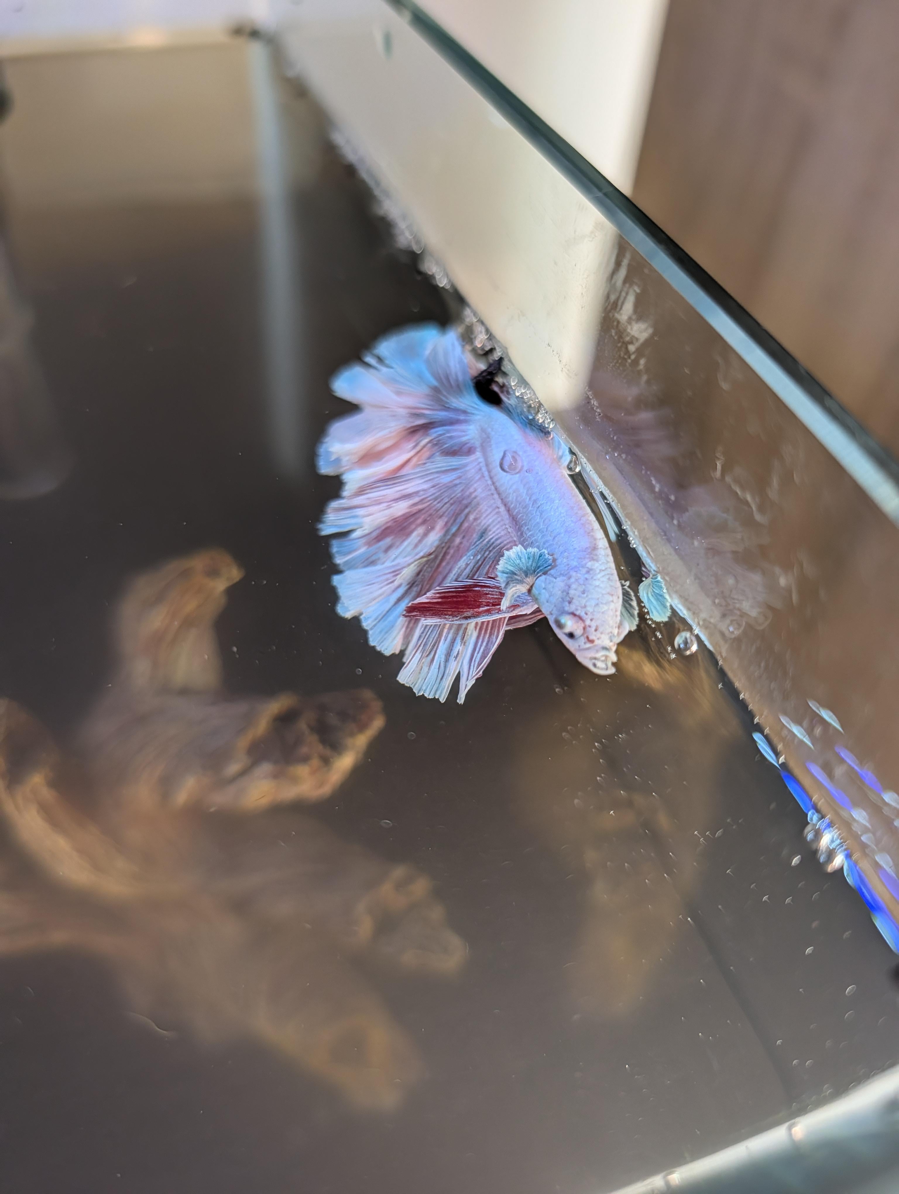 Take another picture of your tank from the front. I don’t see any live plants in your tank, so your betta can actually rest on something. Betta with long fins get tired easily and need something to rest on. Live plants help the water parameters in your tank to stay safe. I just see a wooden log and that is unacceptable. The temperature in your tank needs to be 80 degrees at least. If it’s not, it causes a lot of health issues with a betta in the long run. I always suggest an adjustable heater you can get on Amazon.