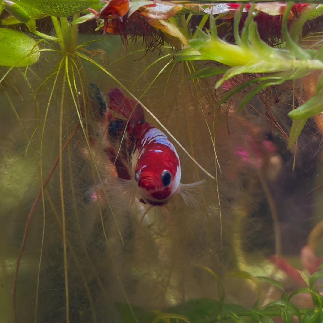 she has a couple different colors: red, light blue, white, neon blue (end of body and tail), pastel shimmery purple and blue on her back, and black