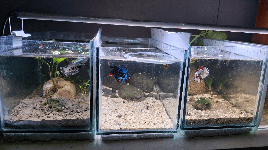 they are so pretty!!! Bigger tanks with heaters, dividers and filters would do them some good! also I think the furthest right one should definitely be named samurai! that coloring is so awesome!!! 👏