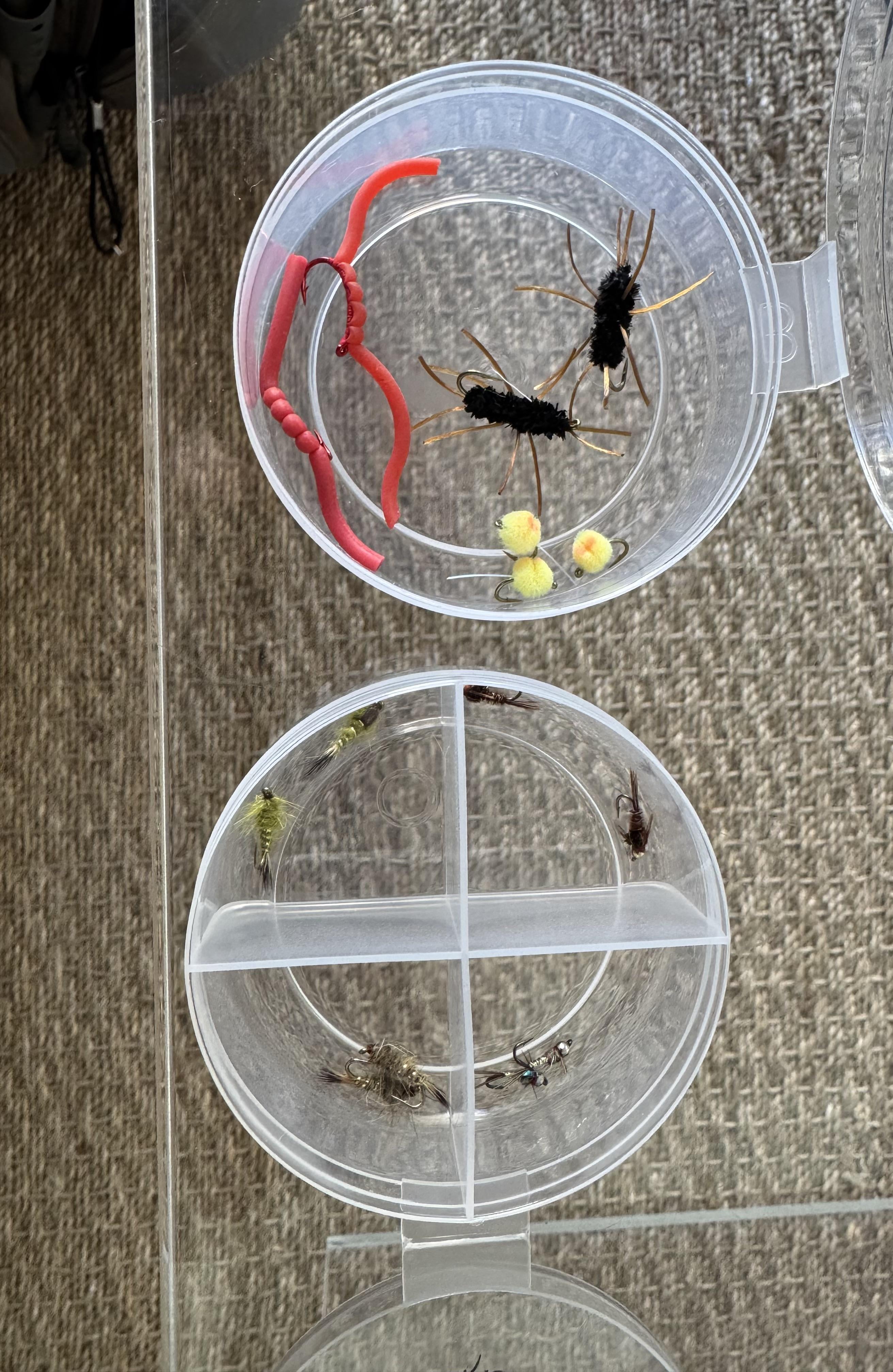 I purchased the flies in the photo at the recommendation of a fly shop and am thinking of starting with an egg and the rainbow warrior or another of the nymphs (I forgot the names of the other tan / green ones).