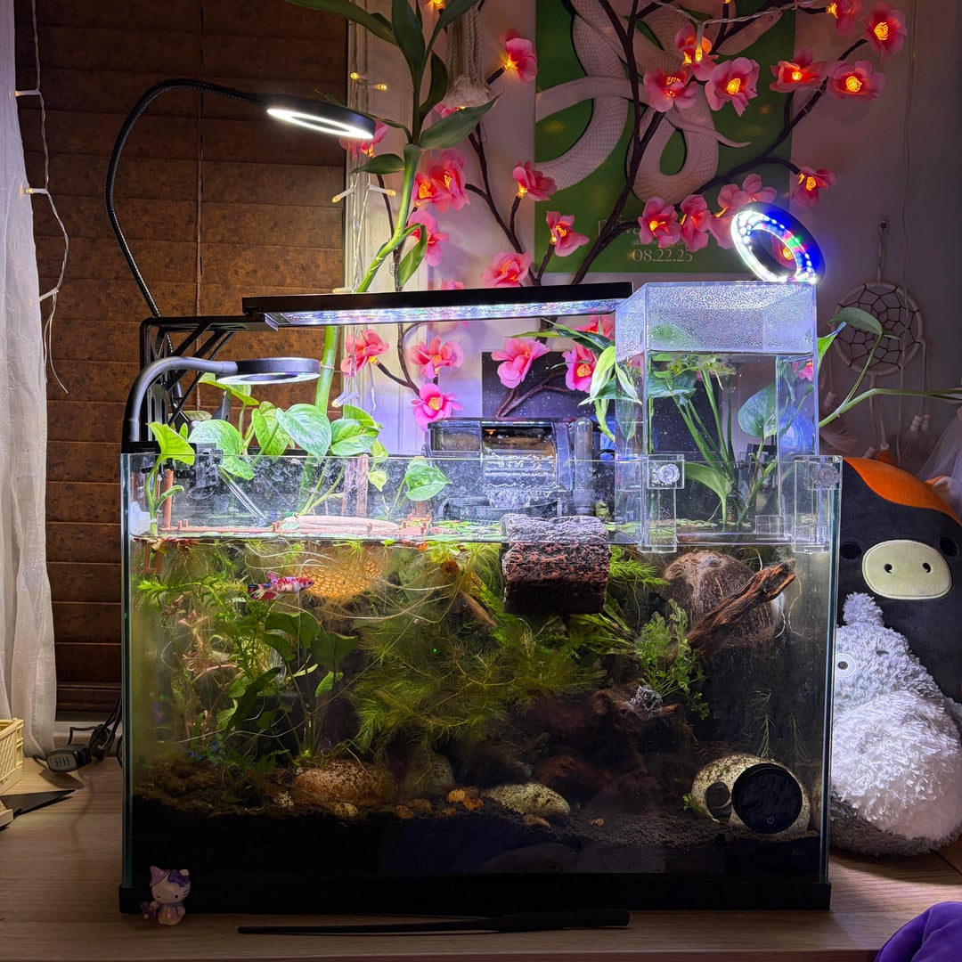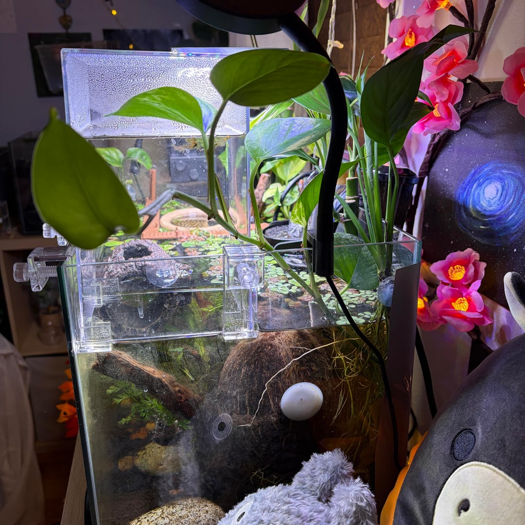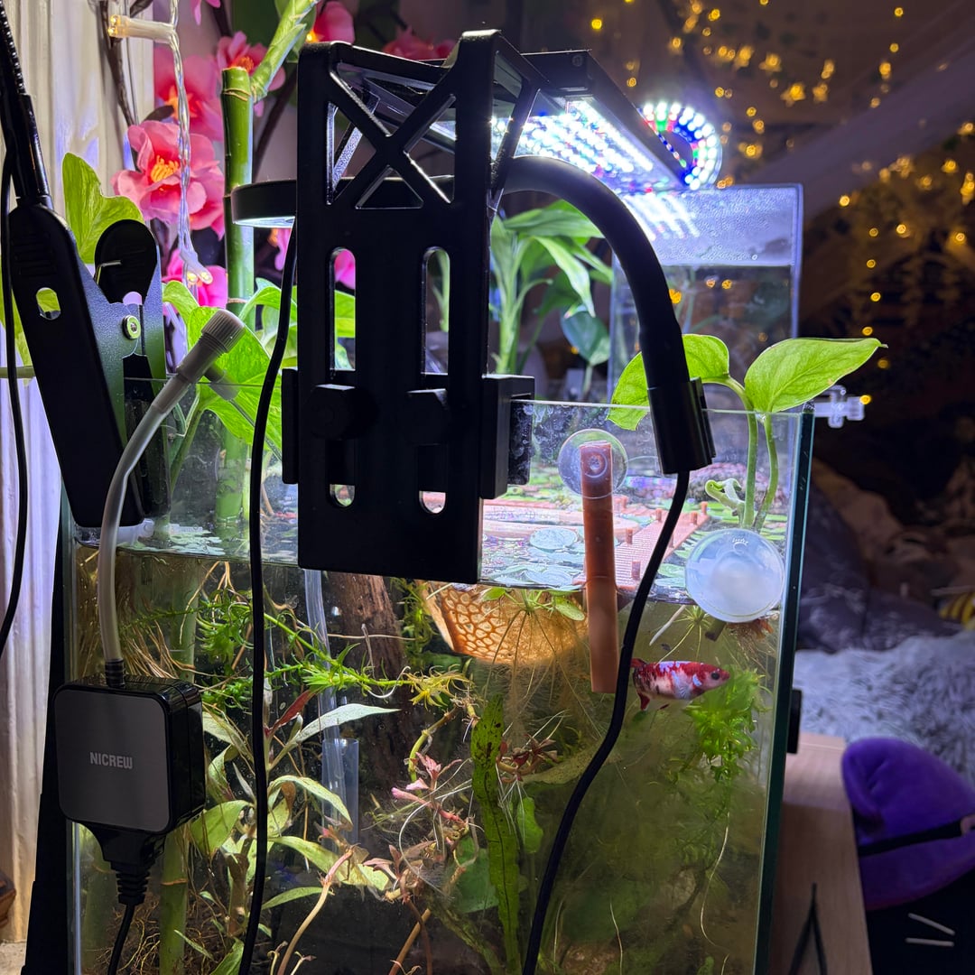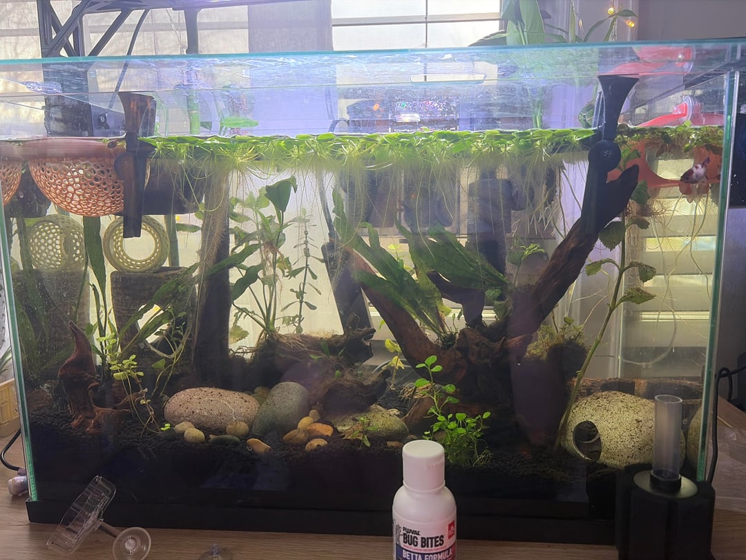 posting because I had some questions about my full tank in a recent post on here! this is a 10 gallon tank with my koi female betta, clementine! I’ve had her since October 2025. she started out in a 6 gal cube and after a month of cycling this 10 gallon I was finally able to give her a more spacious home! she used to have more floating plants but I got rid of a lot due to having the negative air pressure fish tank + wanting more light to go to planted plants.