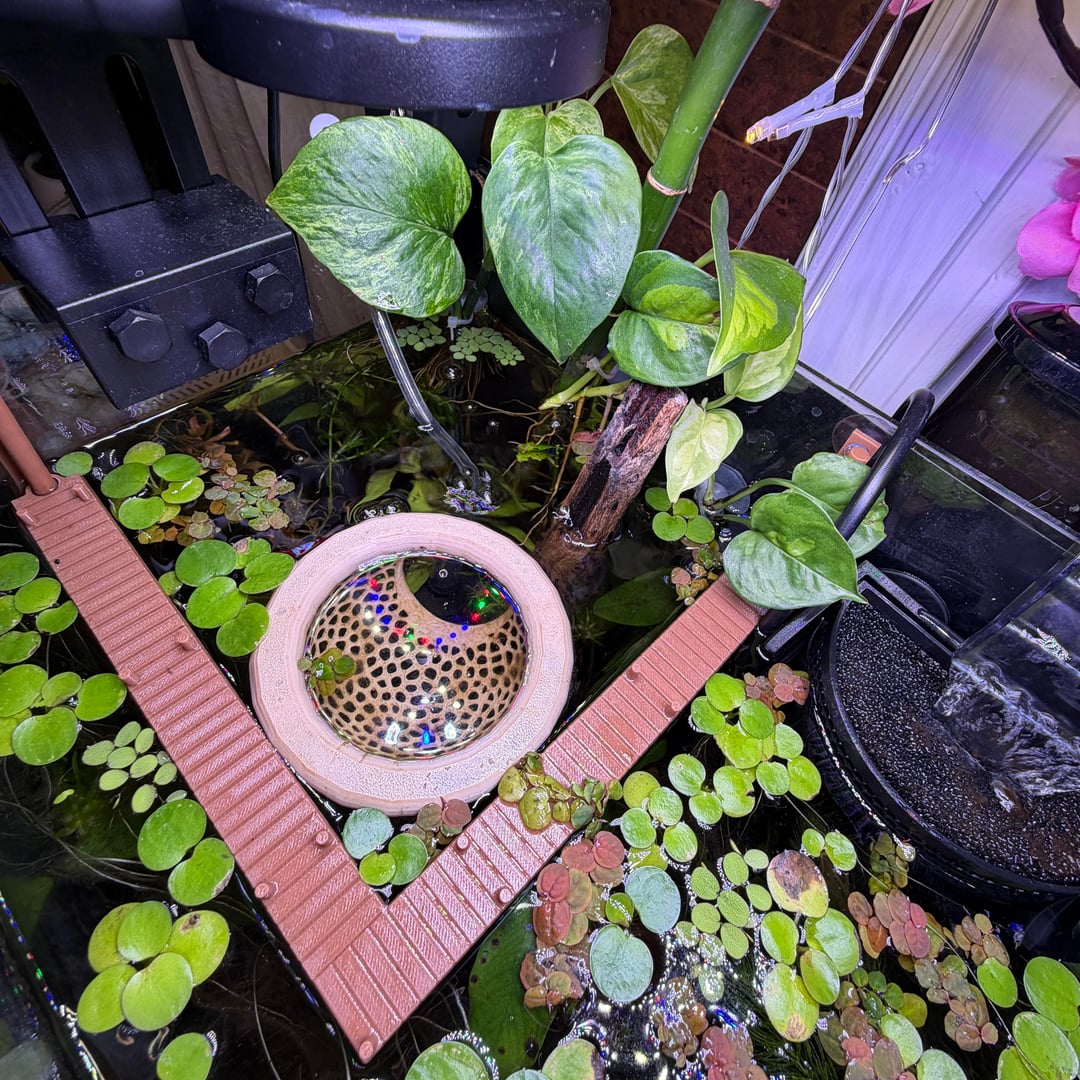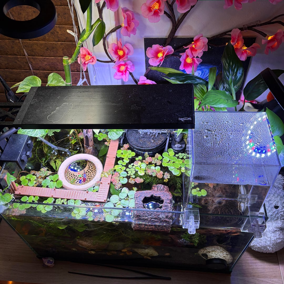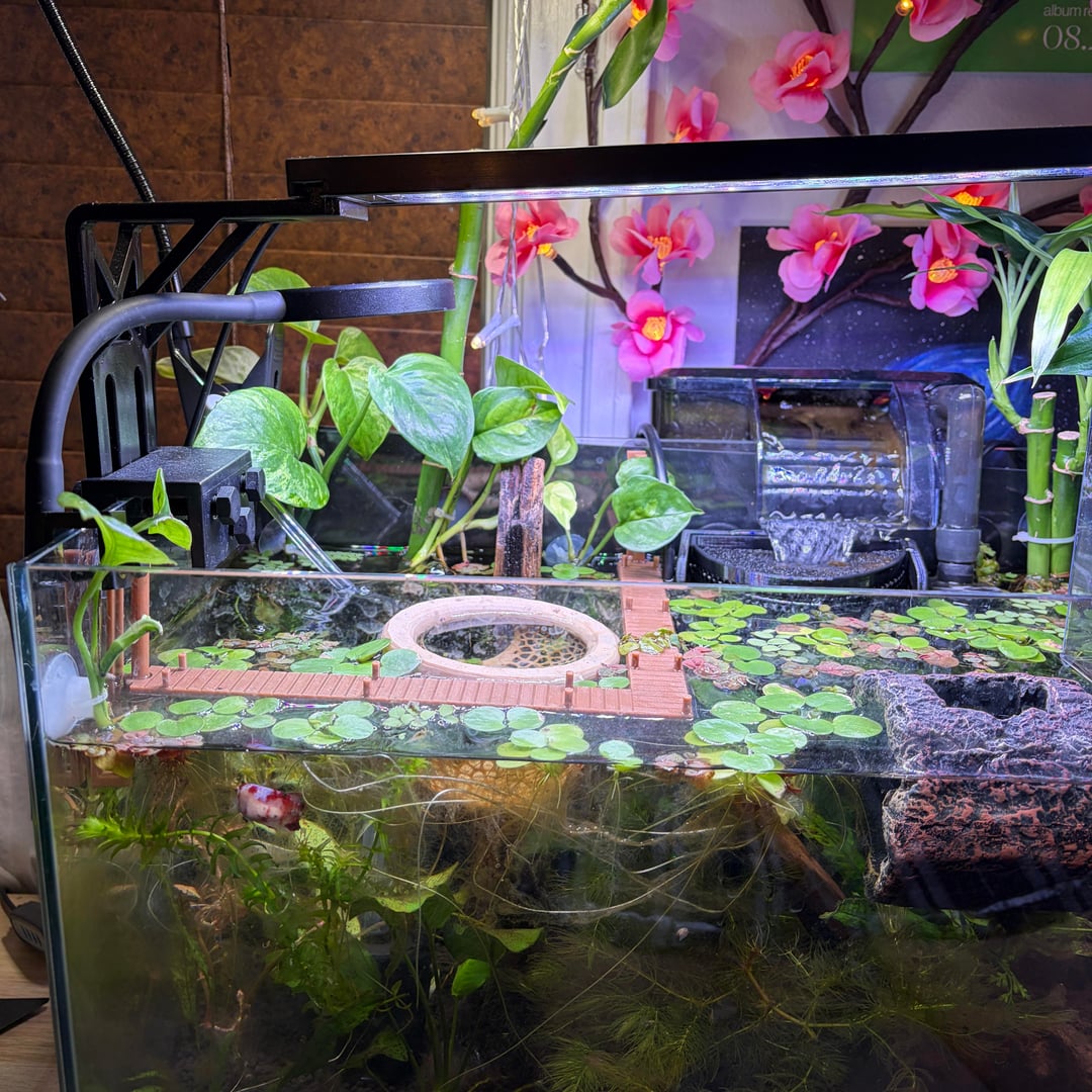posting because I had some questions about my full tank in a recent post on here! this is a 10 gallon tank with my koi female betta, clementine! I’ve had her since October 2025. she started out in a 6 gal cube and after a month of cycling this 10 gallon I was finally able to give her a more spacious home! she used to have more floating plants but I got rid of a lot due to having the negative air pressure fish tank + wanting more light to go to planted plants.