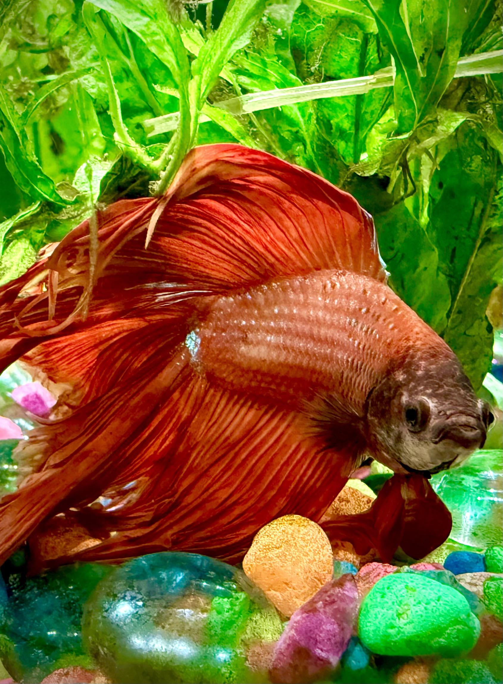 I know I know… Plants good, colored gravel bad. Fred decided to hang out under the plants today and posed for me at the front of the tank. No reflection made for a pretty good shot of him.