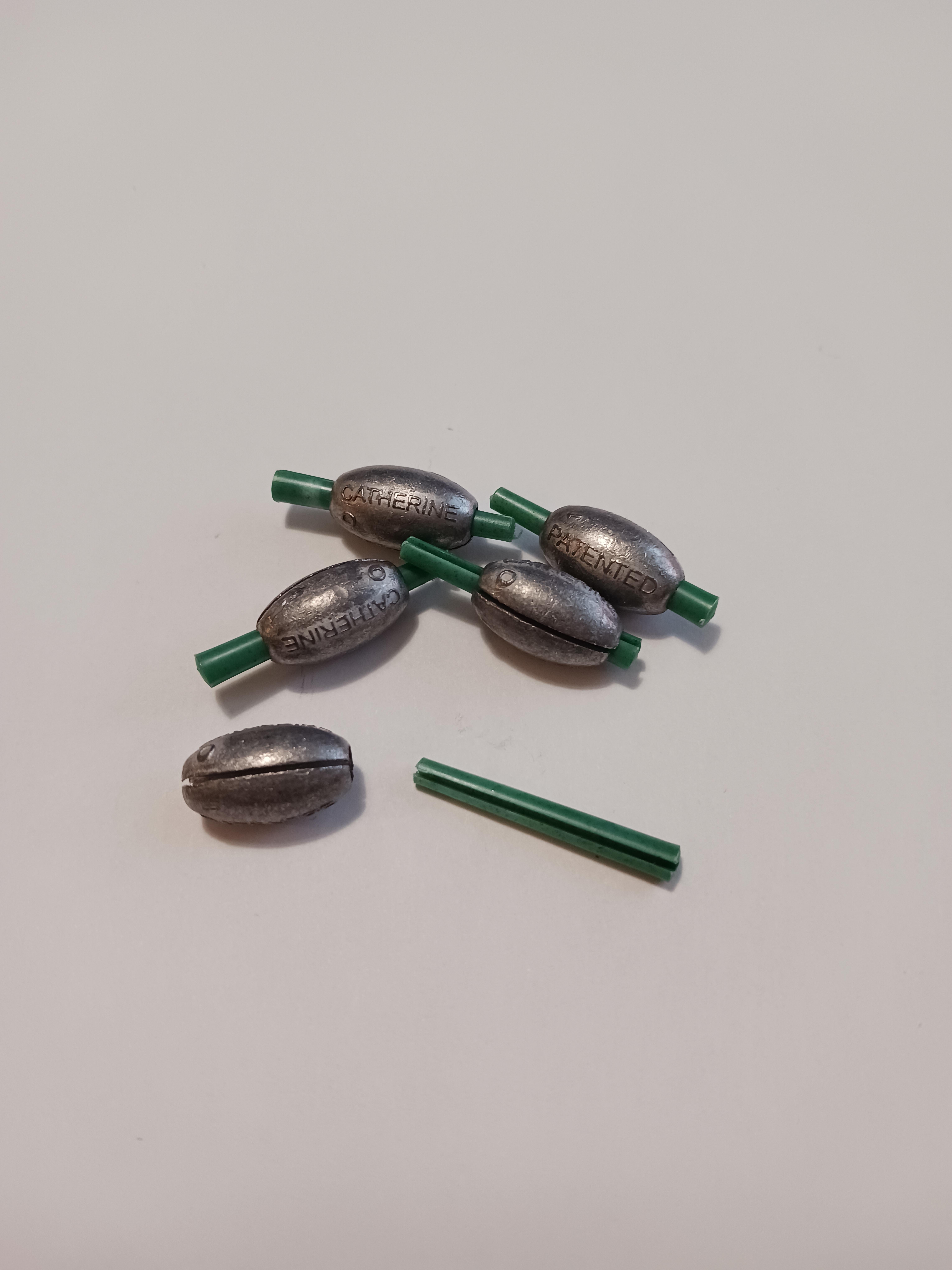 They’re olive weights, and the design allows them to be fitted to a line after the rig has been tied. The split in the tubing and the olive allows both to be slide sideways onto the line, then one slid inside the other to lock it in place. It allows you to adjust the amount of weight, and the position of the weight, without retying the rig when you want the weight inline.