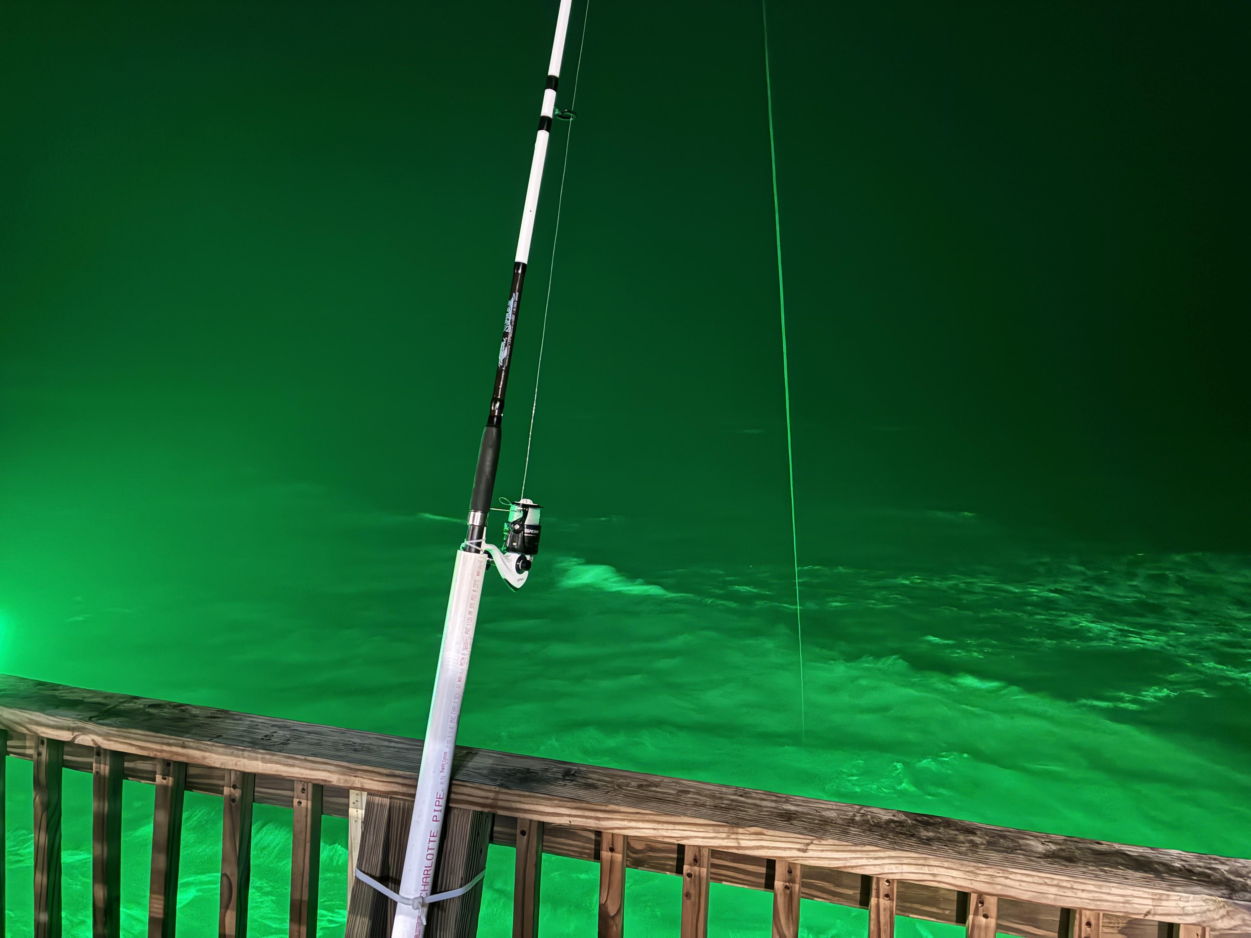 thats jyst the pier lights, green LEDs pull bait in and everything else follows. totally normal down there, fish dont care at all. looks weird but it works pretty well at night.