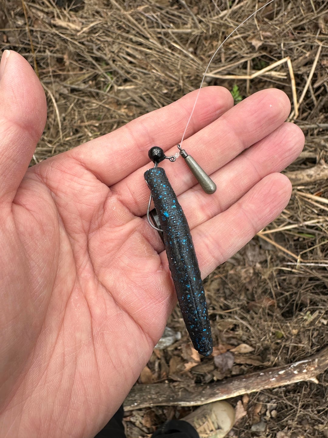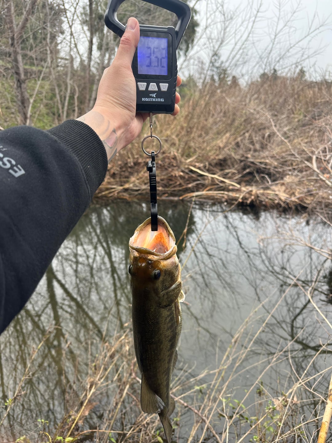 3.52lb PB on the funky weedless ned rig. Only had a 1/16oz jig head so added the 1/8oz sliding weight to get to the 1/4oz minimum lure weight of the new rod. Surprisingly gave it a pretty sweet erratic action when popping it off the bottom.