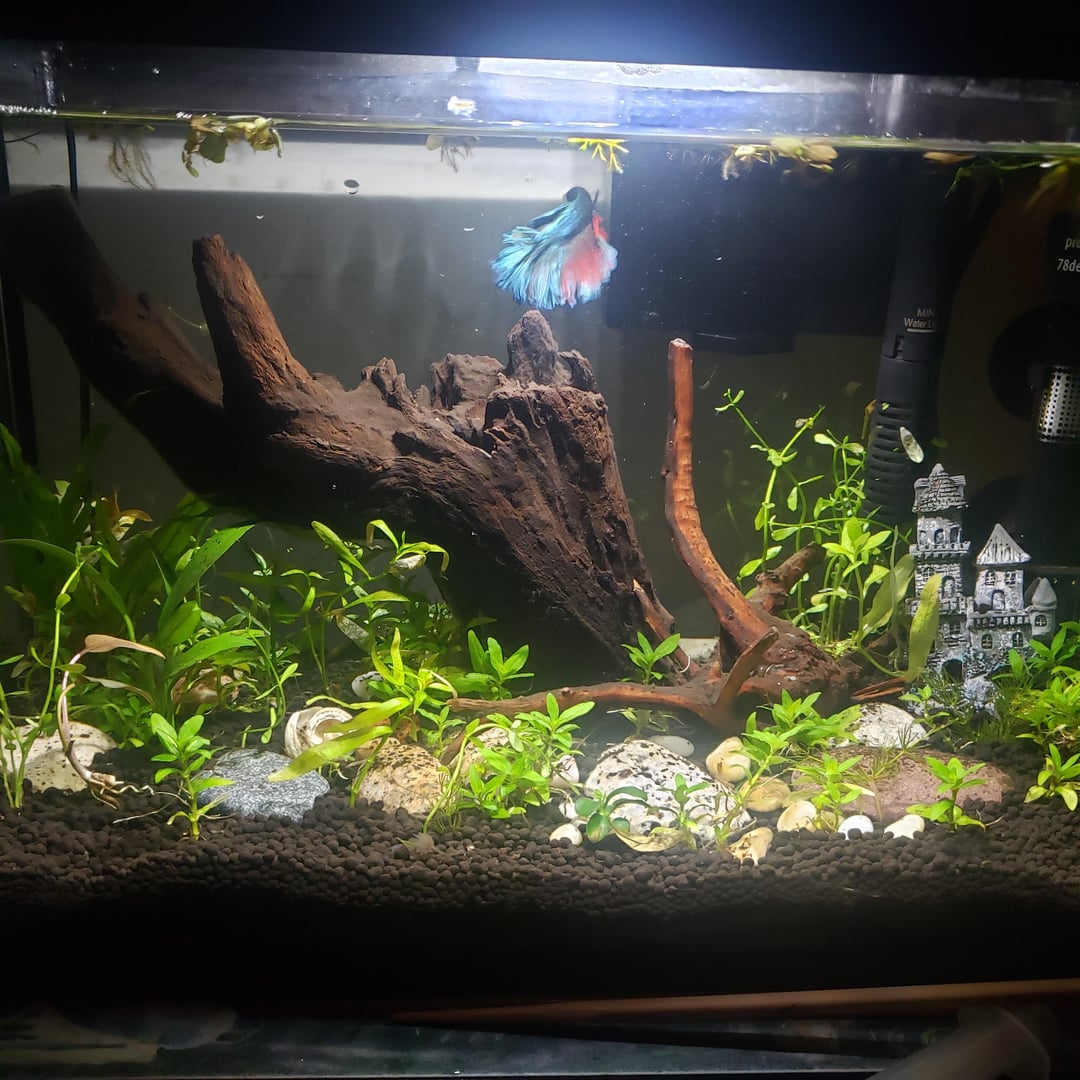 The tank set up looks good! Iād maybe just add a cave for him. Mine loves swimming in and out of it. I just smashed an old Tera cotta pot I had lying around and used the bottom. Water looks good too.