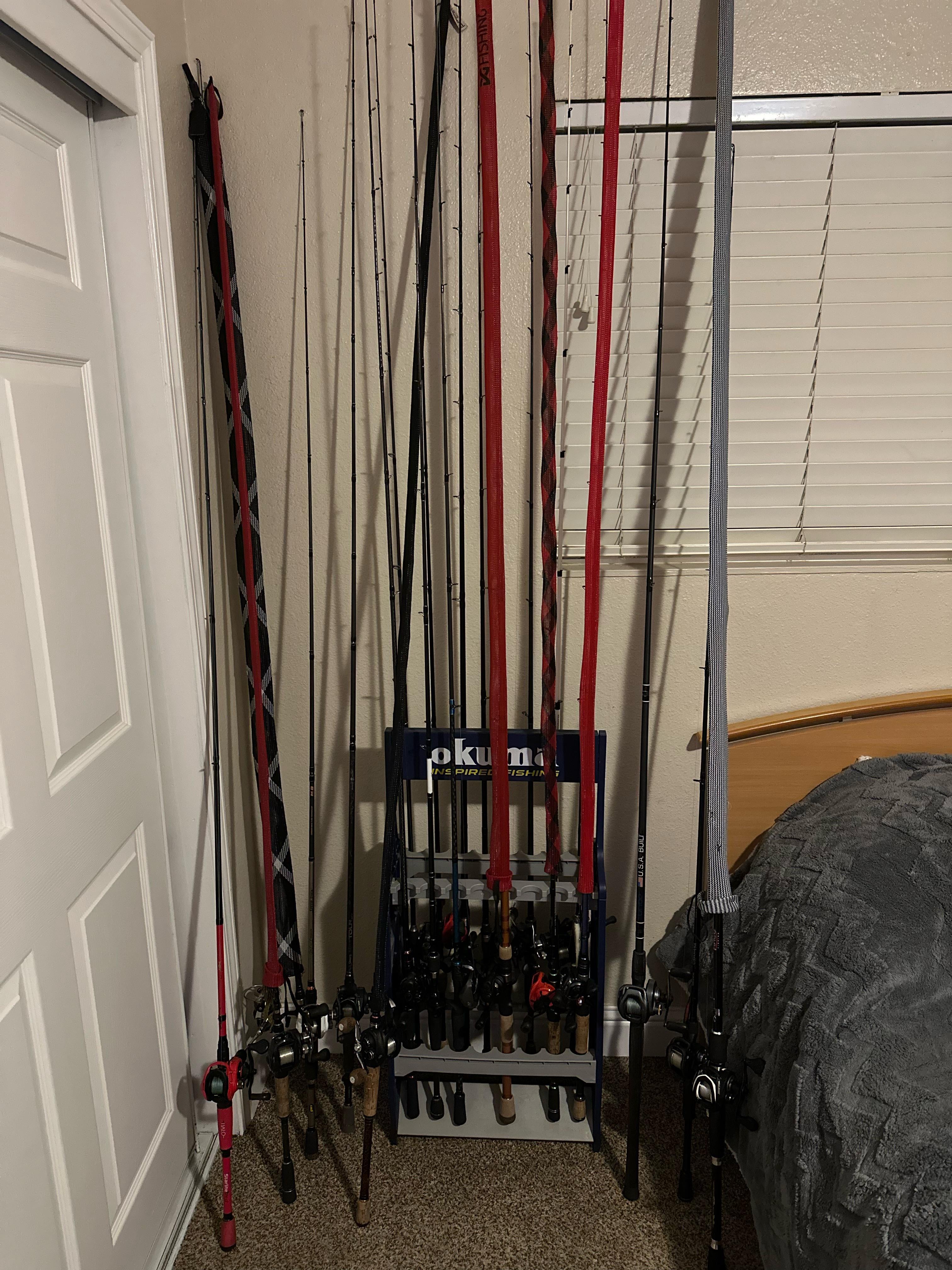 Started bass fishing about 4 years ago and this is my collection of fishing gear so far. Yes I use every single combo for something different. It’s difficult since I fish off of a kayak and rod space is limited since and yes I keep them all in my room.