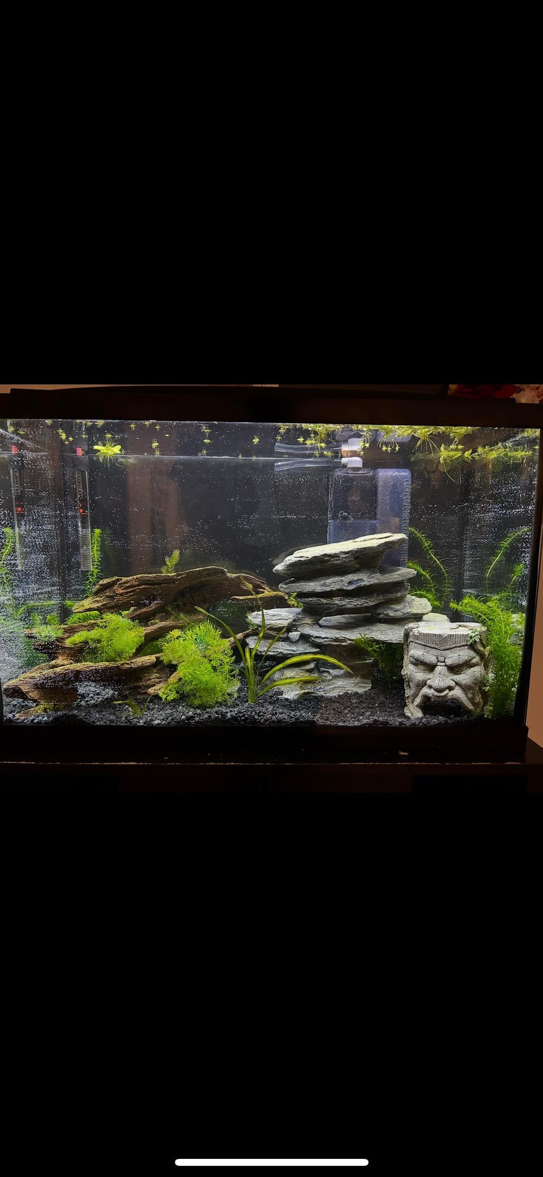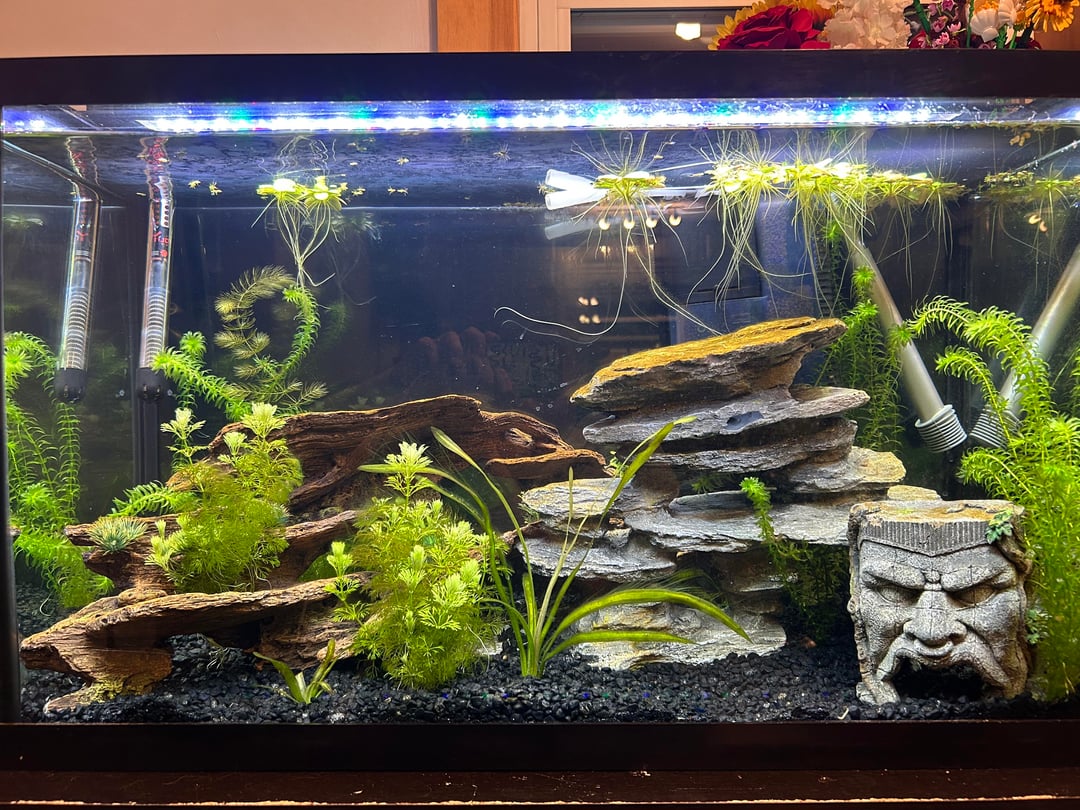 First time trying a planted tank. 30 gal. I started the cycle two weeks ago with a seeded filter and just put some blue neos in and they seem to be doing well. After the shrimp have babies I’ll get a betta.