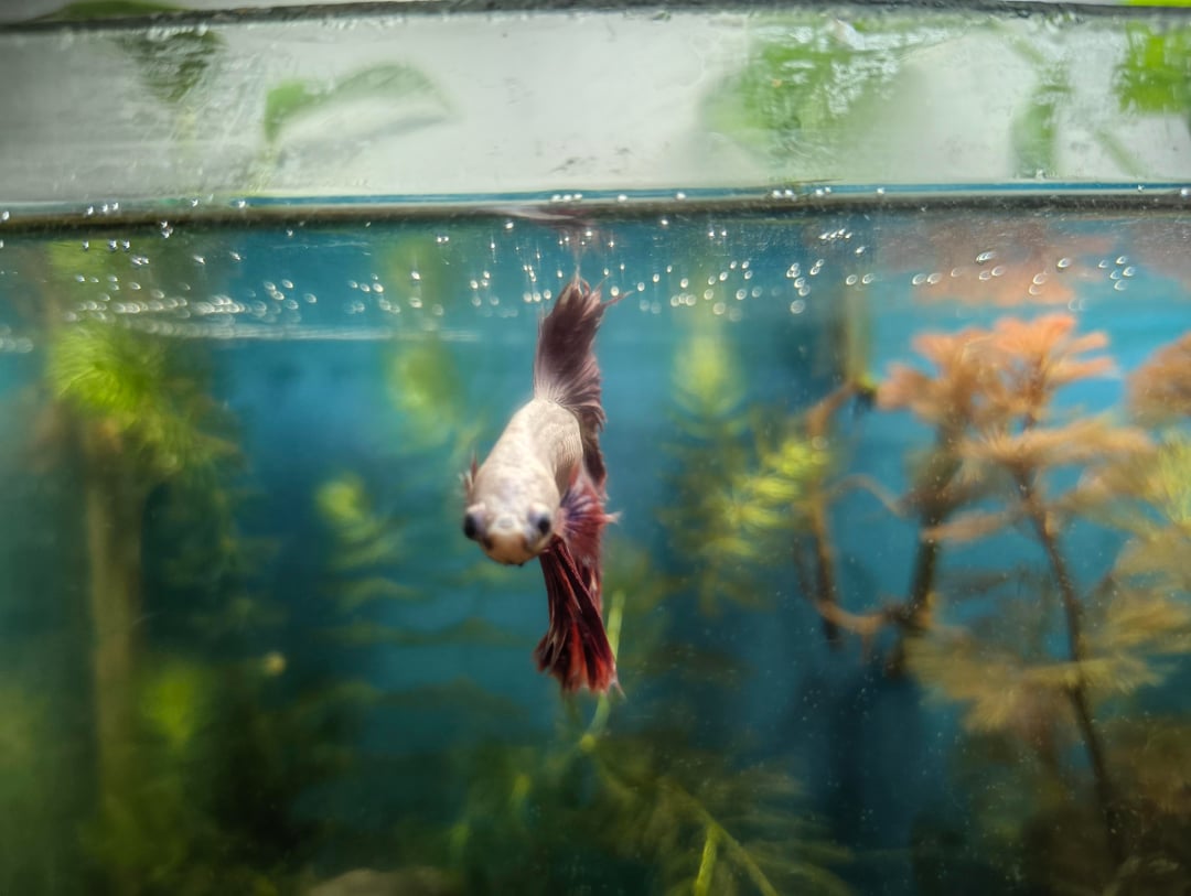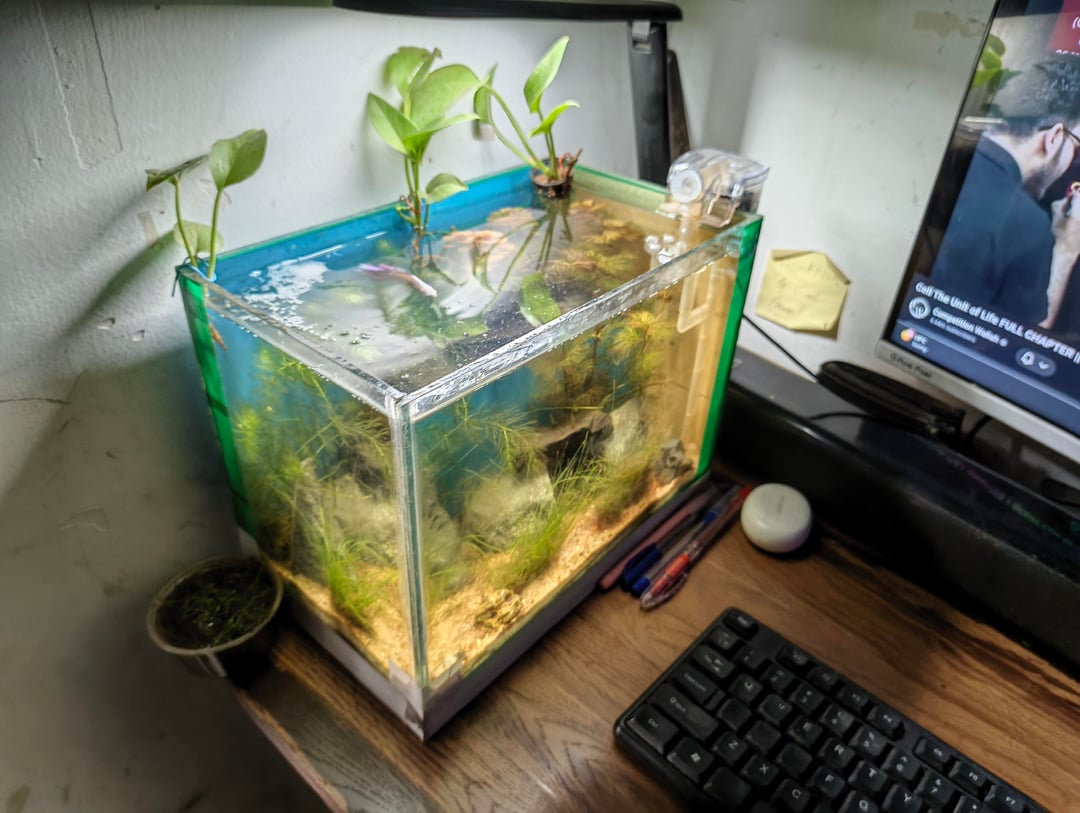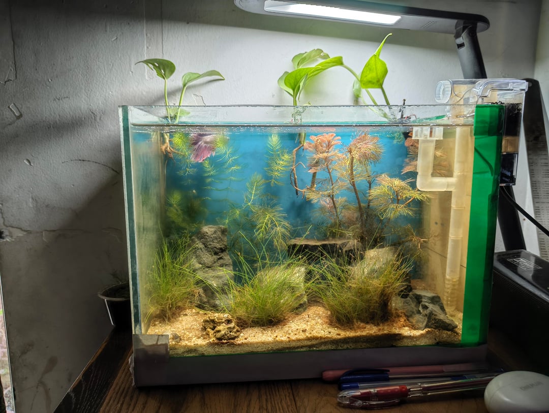 I added few plants in the tank, which are some hornwort stems and red foxtail stems, thos the foxtail requires CO2 injector to be actually red, it still gives good orangish color which I think is better than red for the betta, couldn't find some floaters around me anywhere so floaters are still in wait ,