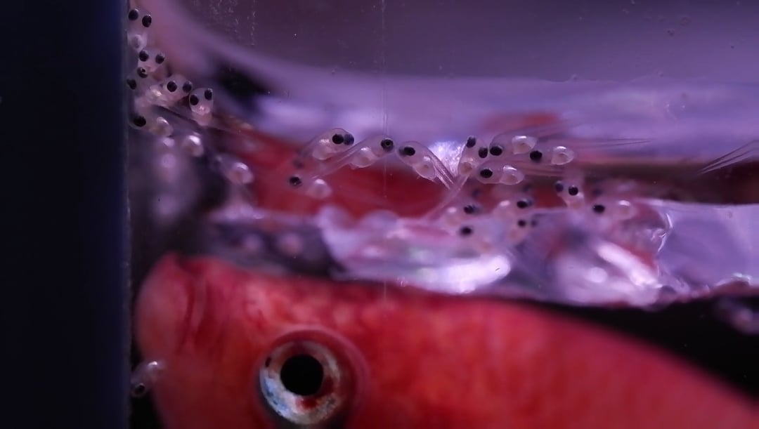 Commentary: At this stage when the yolk is almost fully absorbed (a day or two later after the previous post) the fries are nearly free swimming. Free swimming means that they are swimming horizontally and are no longer falling down onto the floor. Their dad still looks after them loyally but his job is almost over soon. They clump to the sides where there is water tension and on the surface where there is oxygen.