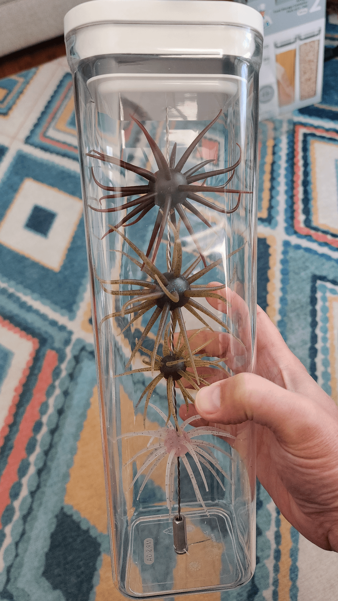 This was made using a polycarbonate food container from Amazon and the Marlin Baits twist wire technique. The top 2 are the Full Send size, bottom 2 are 17mm. I could probably squeeze one more on there if I needed too.