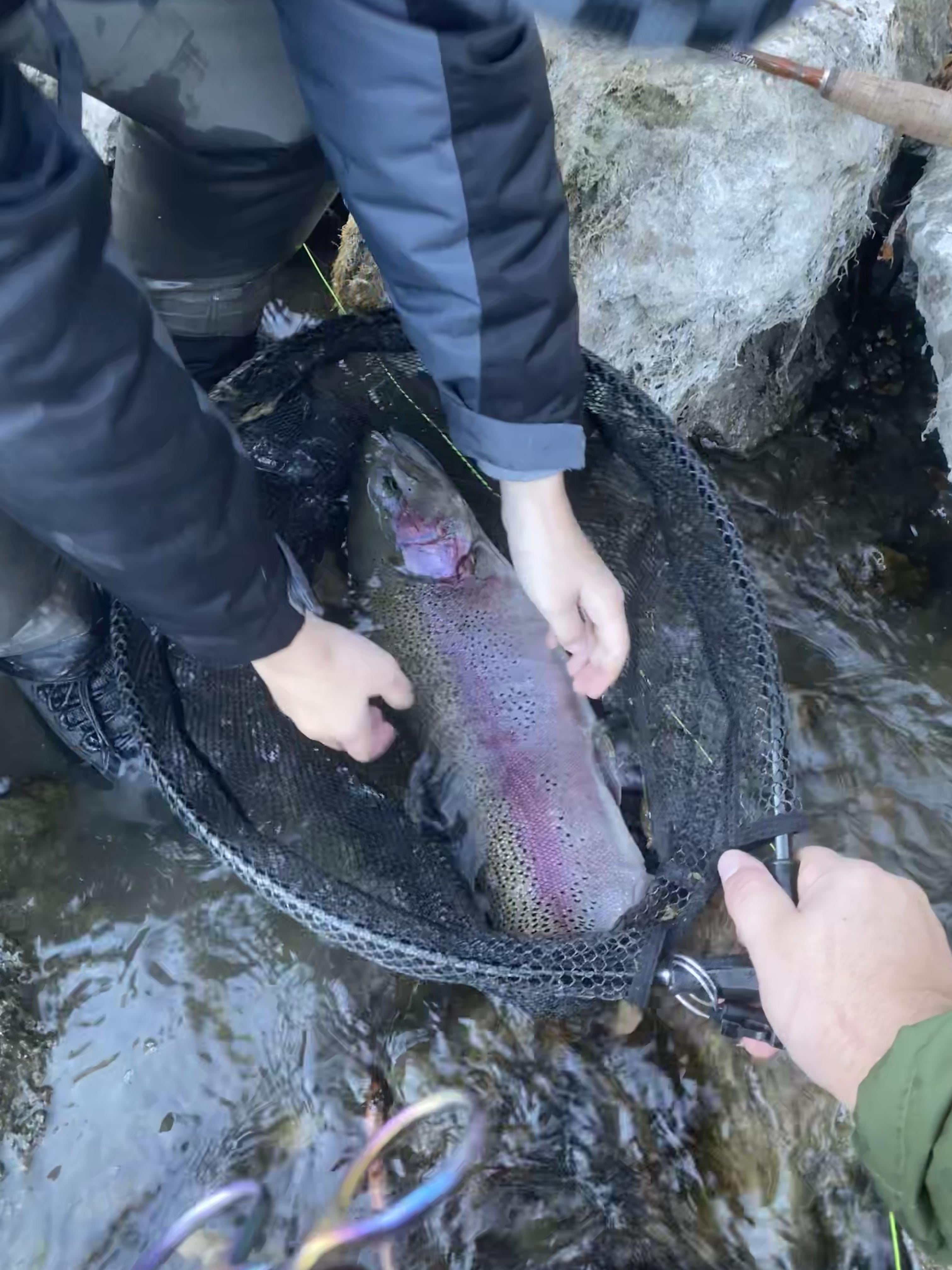 This is the 27 inch rainbow my son expertly caught. I watched it come up for something on the surface and immediately knew that I had to get him a chance at this fish. He cast up and hooked a 12 inch bow and landed it. Did the same thing on a 16 inch bow. The 3rd cast this fish bit. He fought it for a good 10 minutes before landing it. He fought it perfectly. What a special moment.