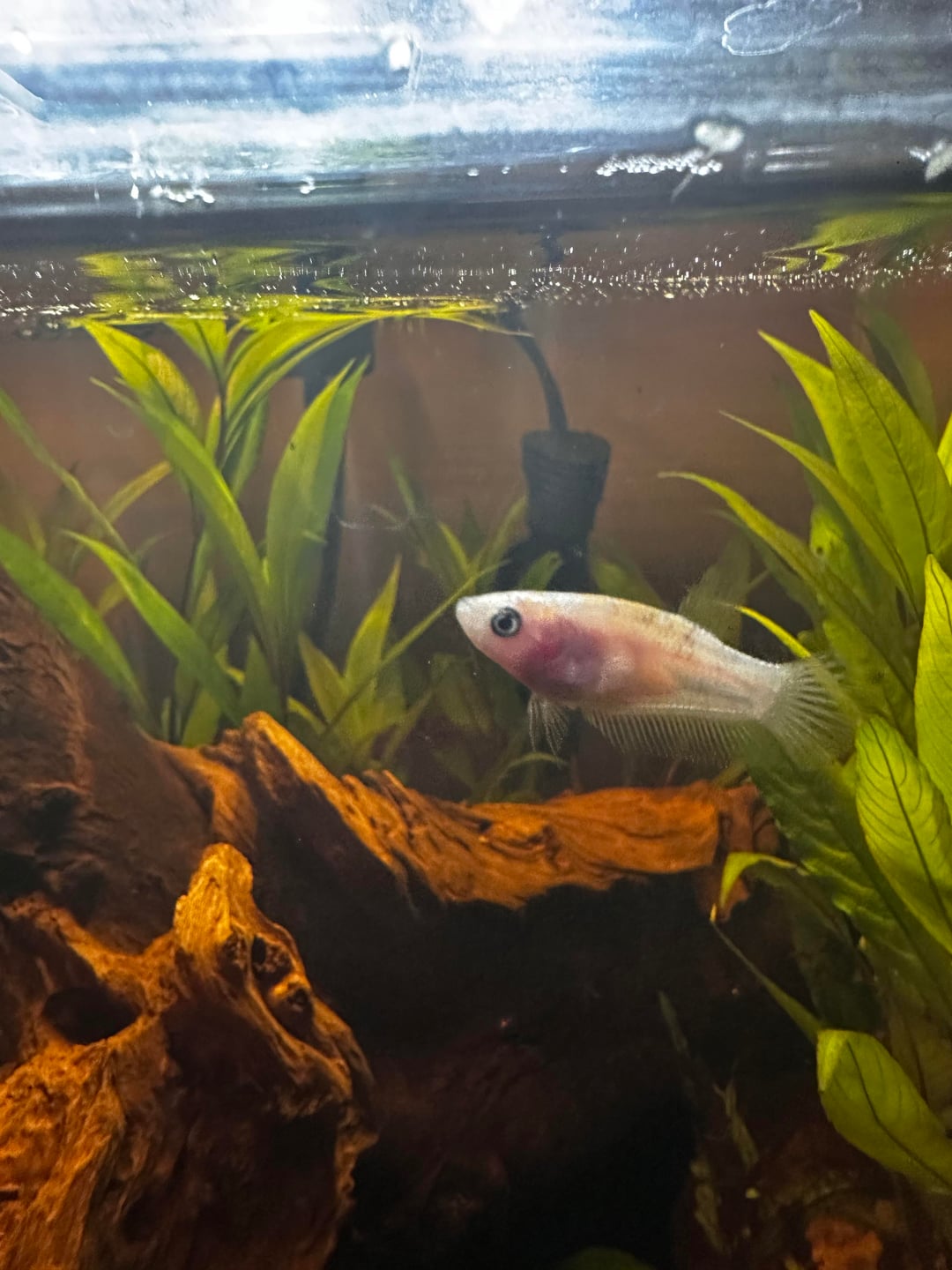 14 gallon cube with him and 10 cherry shrimp, feeding fluval bug bites/blood worms. He’s already changing color! I’m so curious when I’ll know if he’s half moon or not.. can I get advice on how to help him grow quickly?