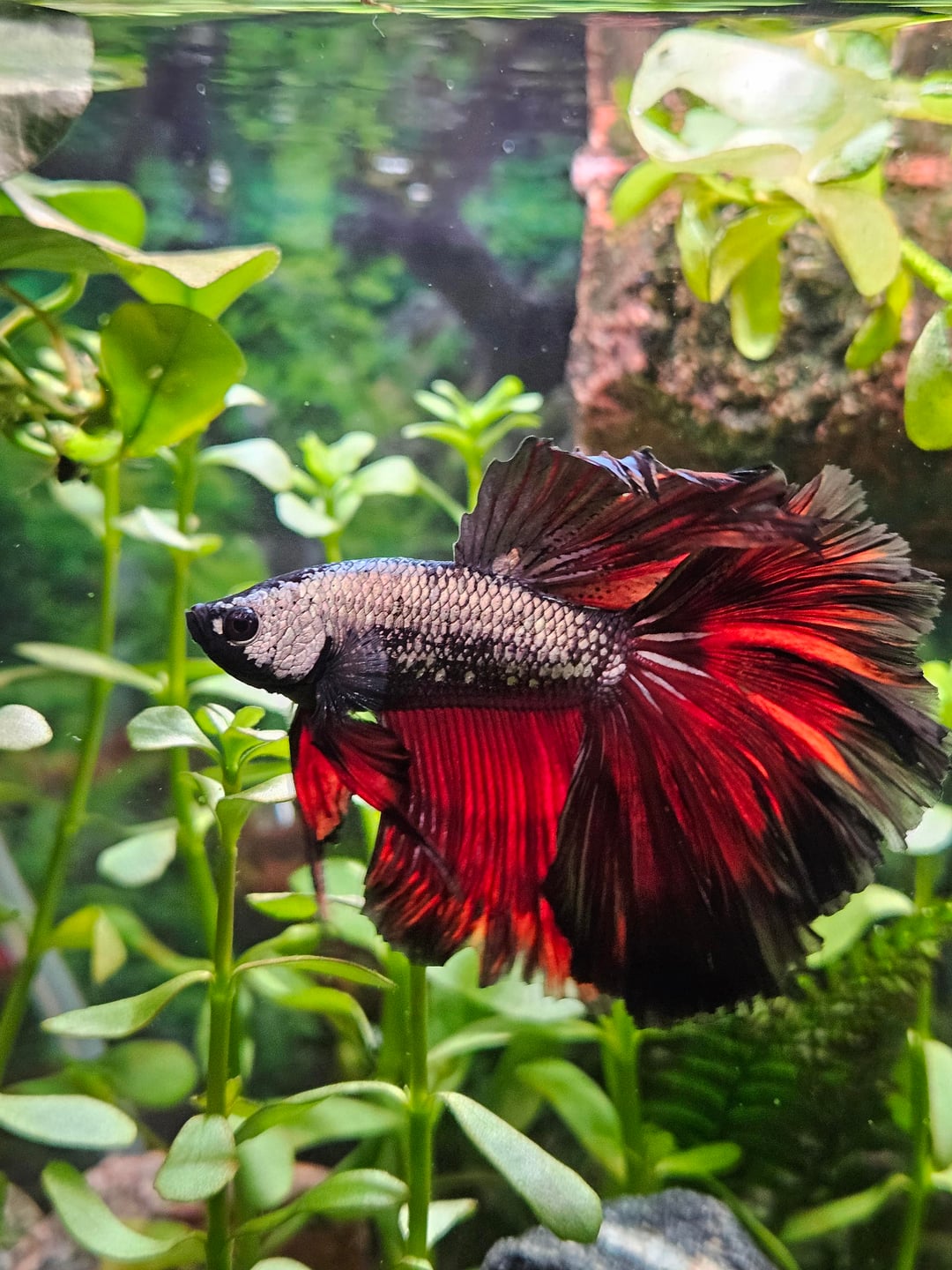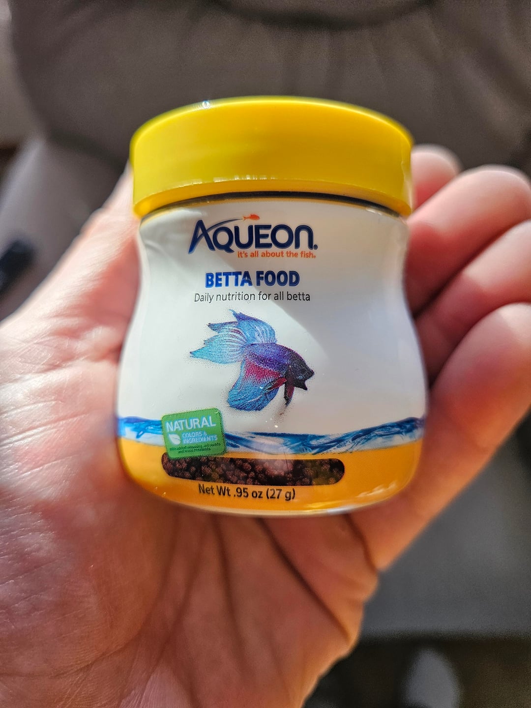 Pretty betta! I feed Hikari betta bio gold, seems to be the best I can find. You wanna make sure whatever you feed is insect protein based, no ground peas or anything (they’re insectivores). Also depending on your fish you might think about feeding a little more, I do 4-6 pellets once a day, usually in the morning, with a couple bloodworms once a week in place of pellets