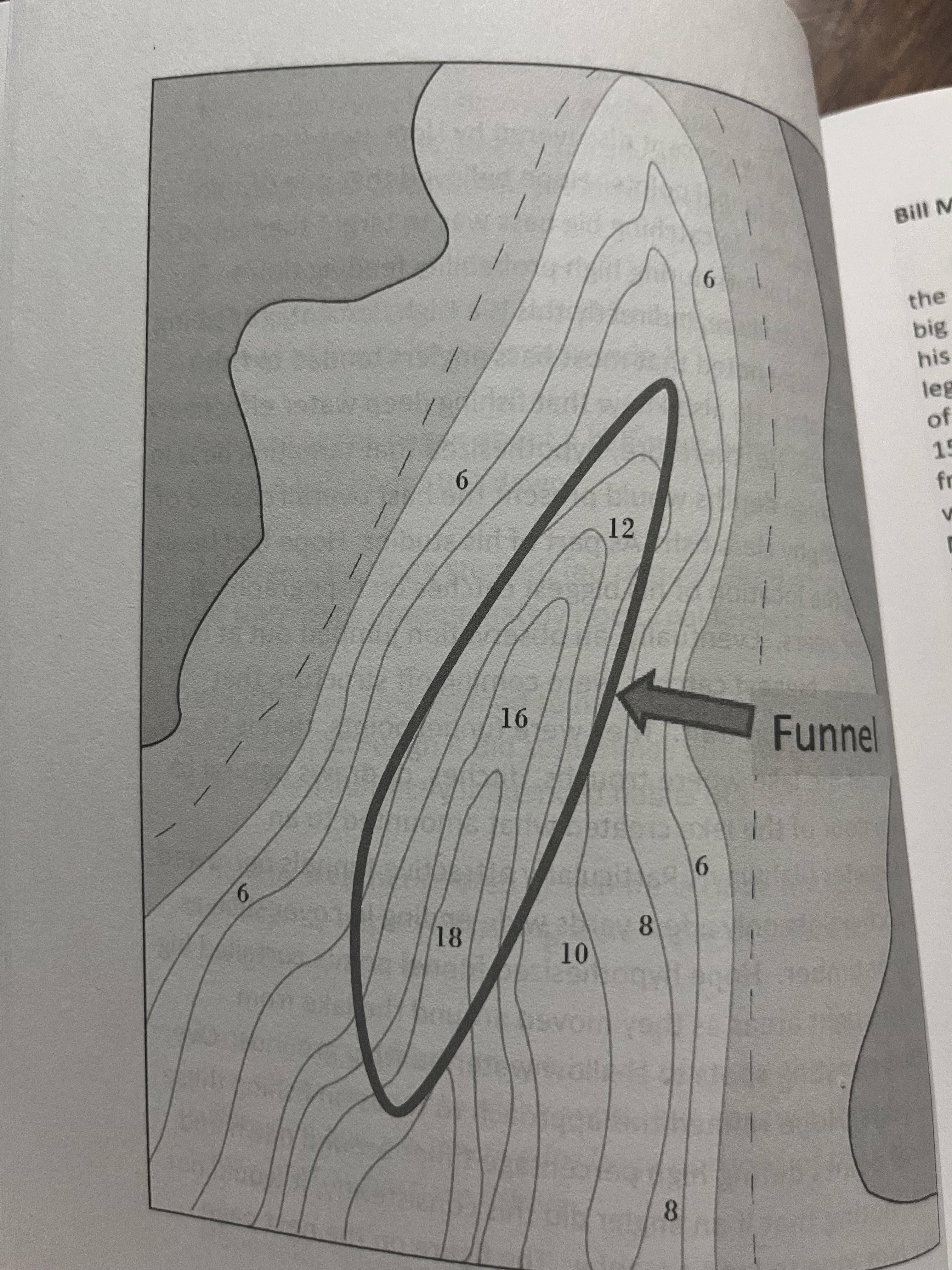I dont call it a funnel, most people call them ditches. Its a dang fish highway in certain times of the year. Imagine a gently sloping bank, then a deep trench in the center that flattens back up towards the back. If your new to these style of maps, one of the biggest take aways is how close the lines are together. Lines super close= very steep bank.