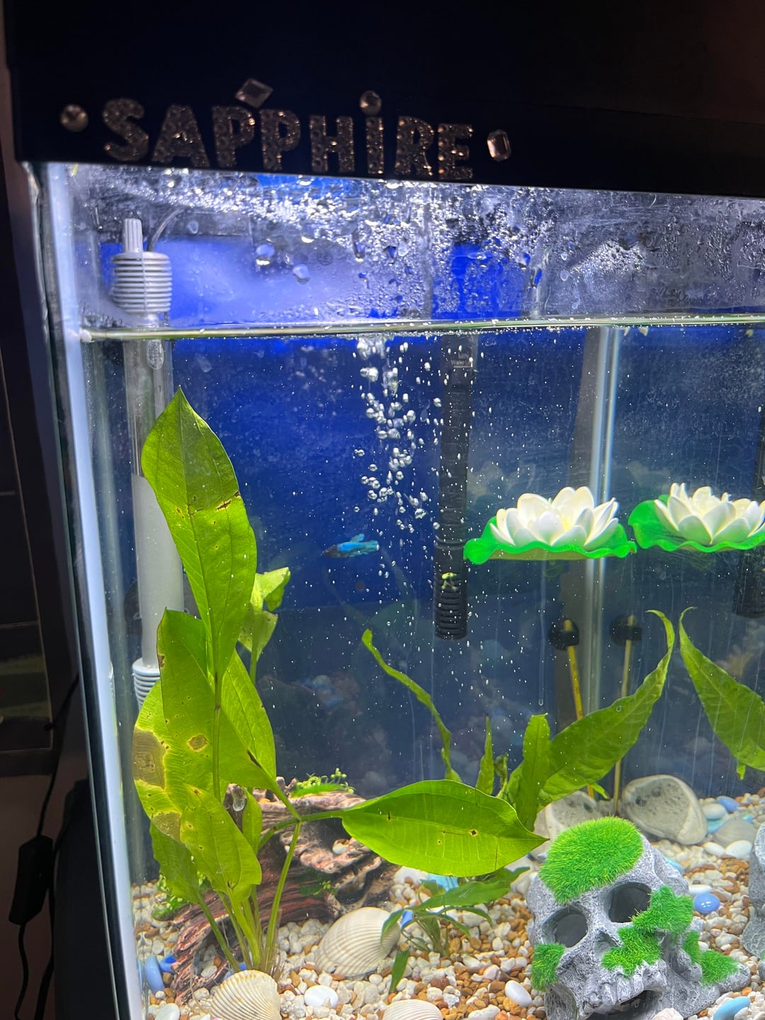 This is our first ever betta fish after cycling our tank for about 2 months. Her name is Sapphire and she’s a halfmoon. She’s so tiny and cute I love her so much. How much should I be feeding her everyday? And what would be the recommended hours to leave the light on and off? Currently I’ve been doing 2 pebbles in the morning and 2 for dinner and then leaving the light on for about 8-10 hours and light off for about 16.