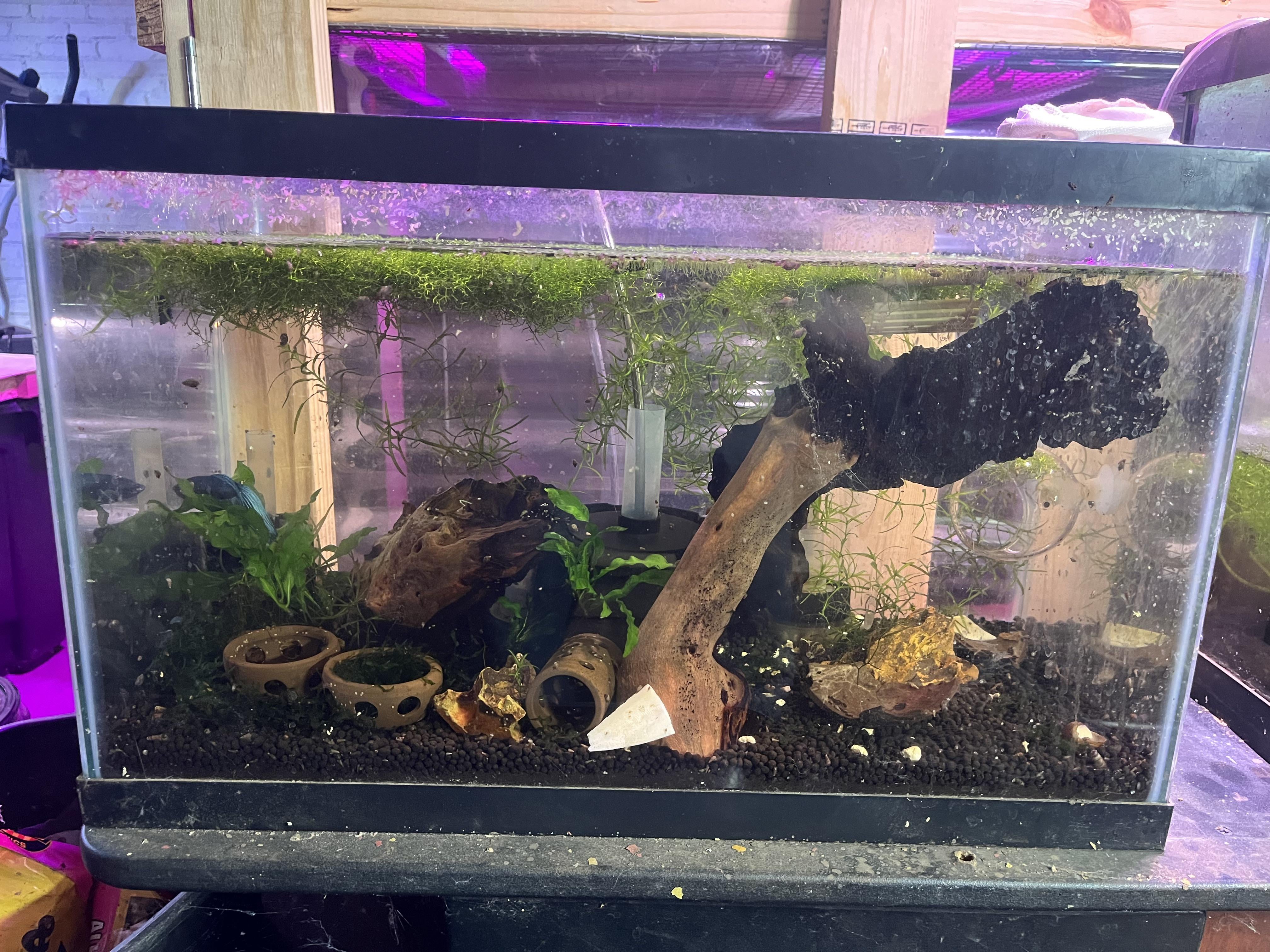 My spouse claims that my betta in this tank requires one of those little suction cup plastic hollow logs to sleep in. He regularly gets voiced over with various renditions of “father I need log” “father I’m sad” when we feed tanks in the morning. I think he has plenty of resting places. Settle this “argument” for us lol