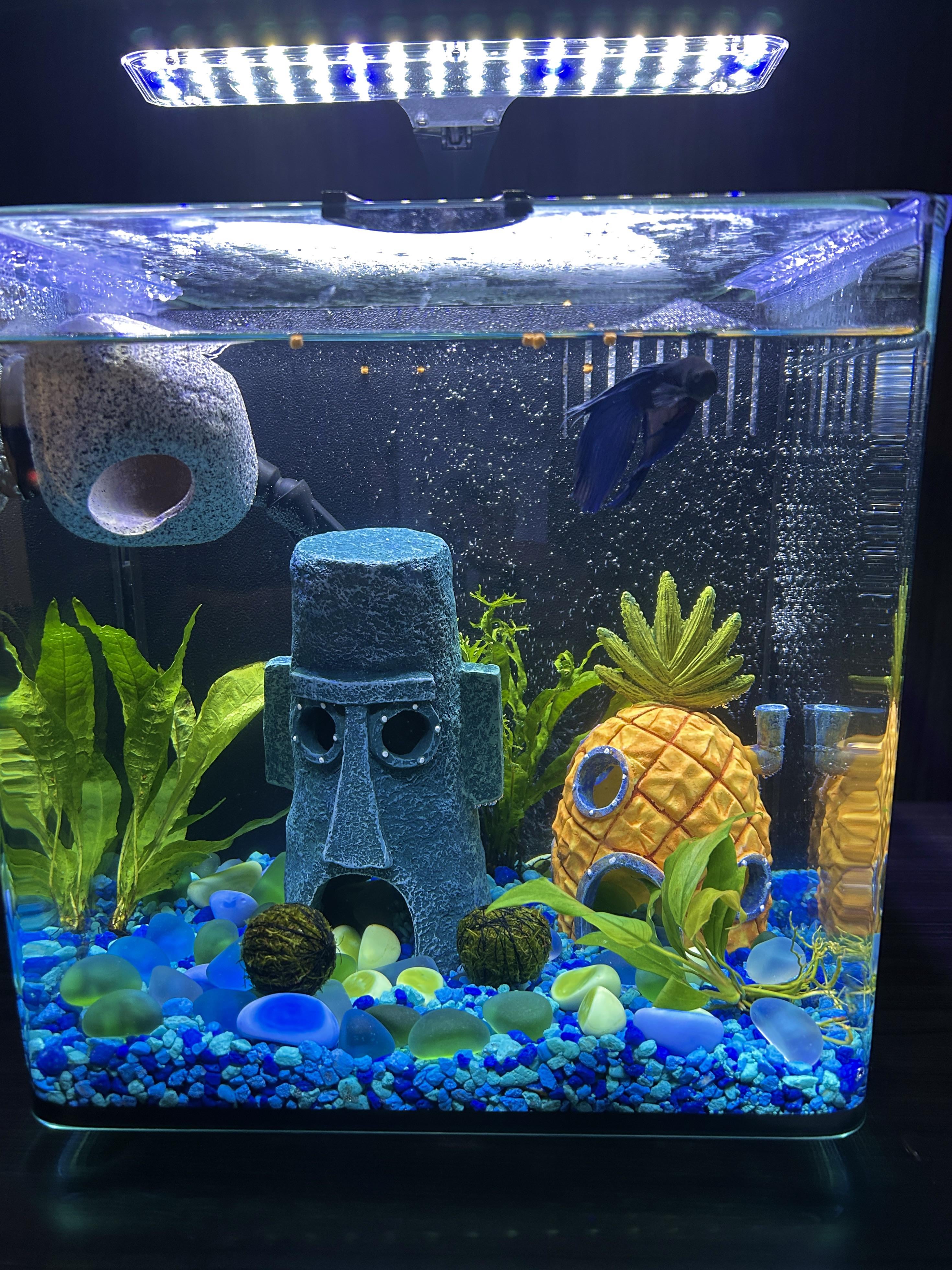 Fifth, maybe purchase some more natural decor and gravel. That bright blue gravel has the potential to leech dye into the water, and it’s rather unnatural looking. The Spongebob decorations can work, but supplement them with stuff like hollow rocks and plants. Bettas like to rest at the surface to breathe oxygen, so get something that will allow it to rest comfortably.