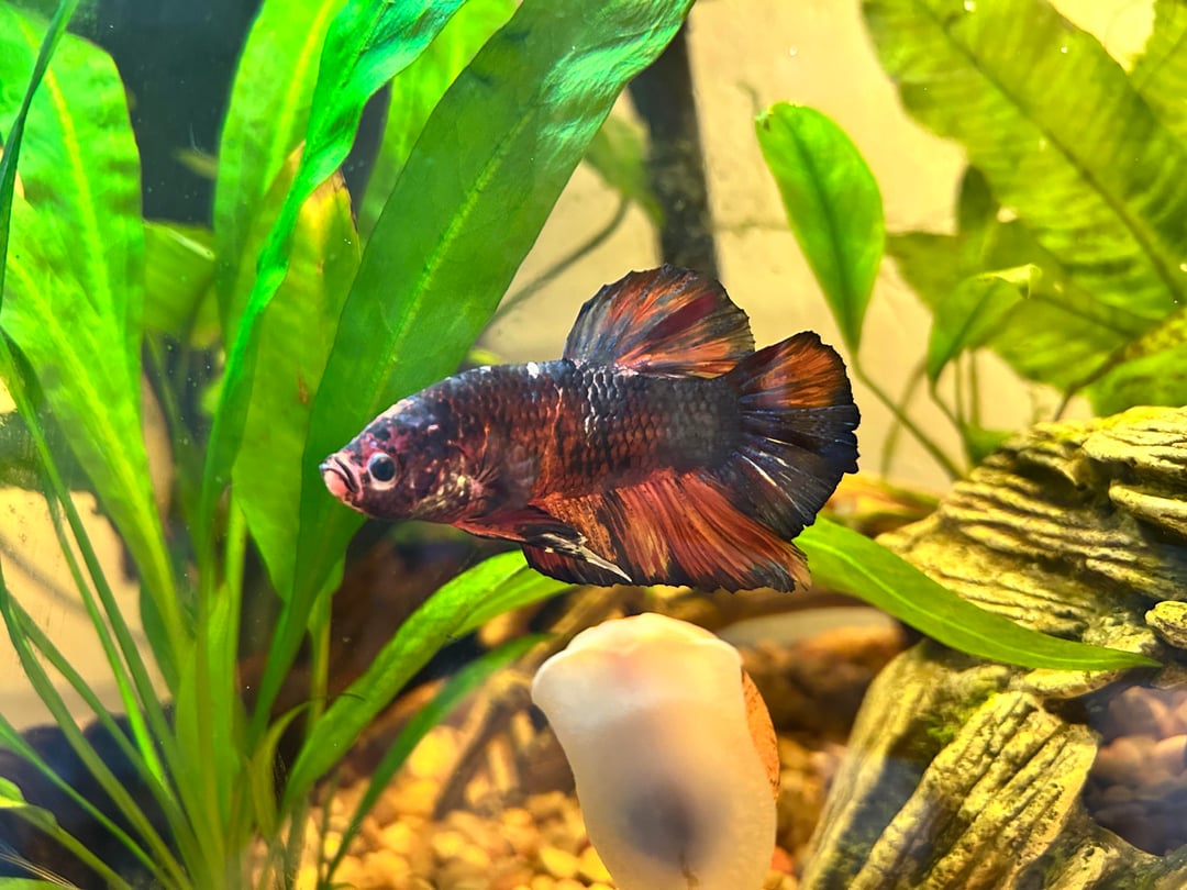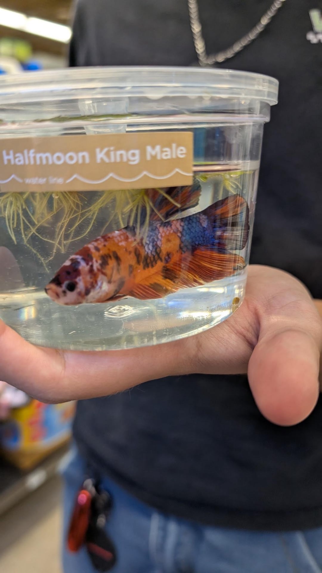 We saw him in a Petsmart and knew right away that we had to save him. We had gotten a 10 gallon tank and were wanting to get a betta fish from an actually ethical local fish store but were just looking around when we spotted him (a king betta who’s much larger than any of the others, I didn’t even know king bettas were a thing until I saw him) in that small of a cup with all of his fins scrunched up to his body and knew we had to save him!