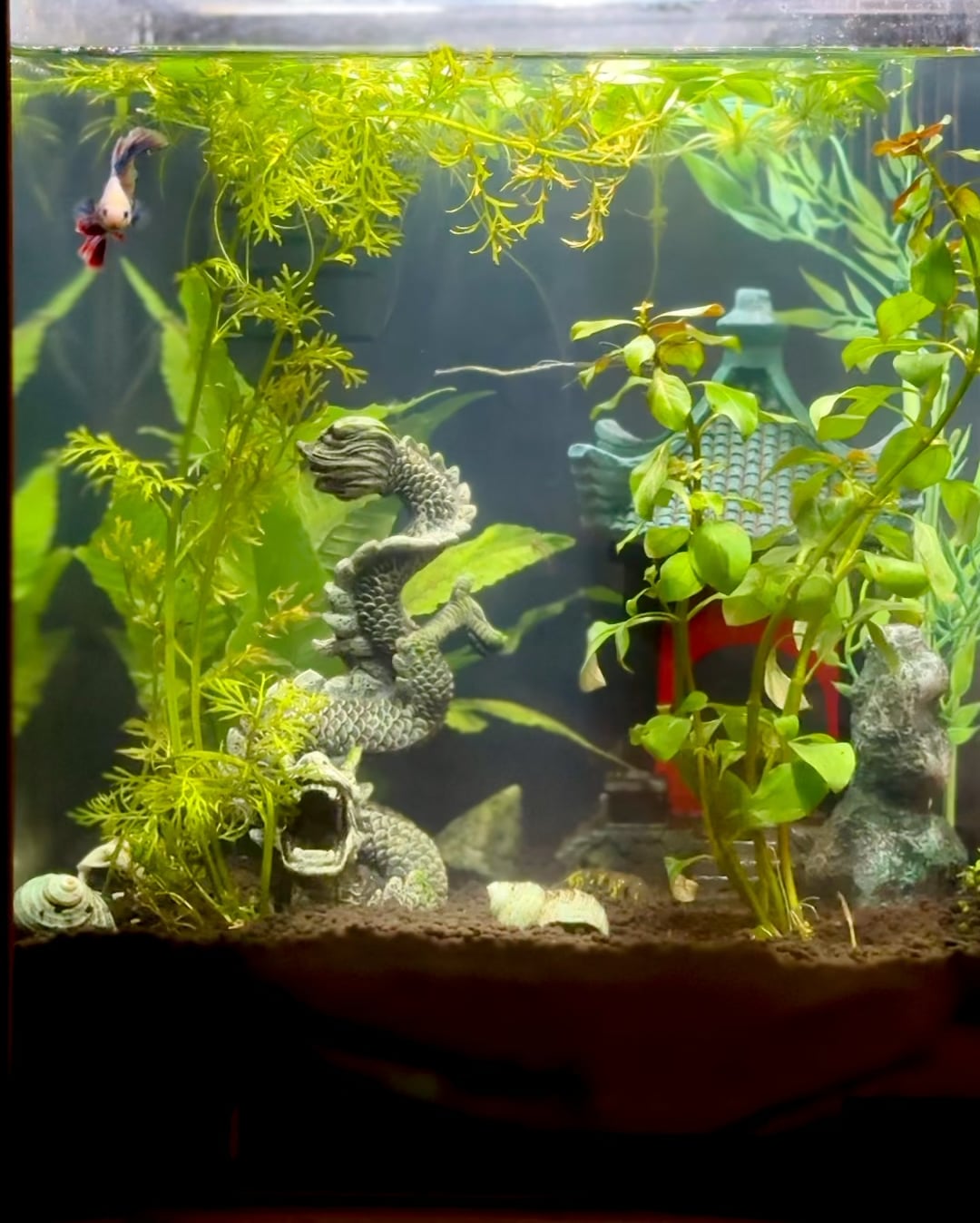 Realistic_Bobcat1105 on January 30, 2026 12:26 am Usually not a big fan of human made decor; but that dragon; and the house hidden behind the plants have some serious aura! What’s the floating plant that you have? A type of water sprite?