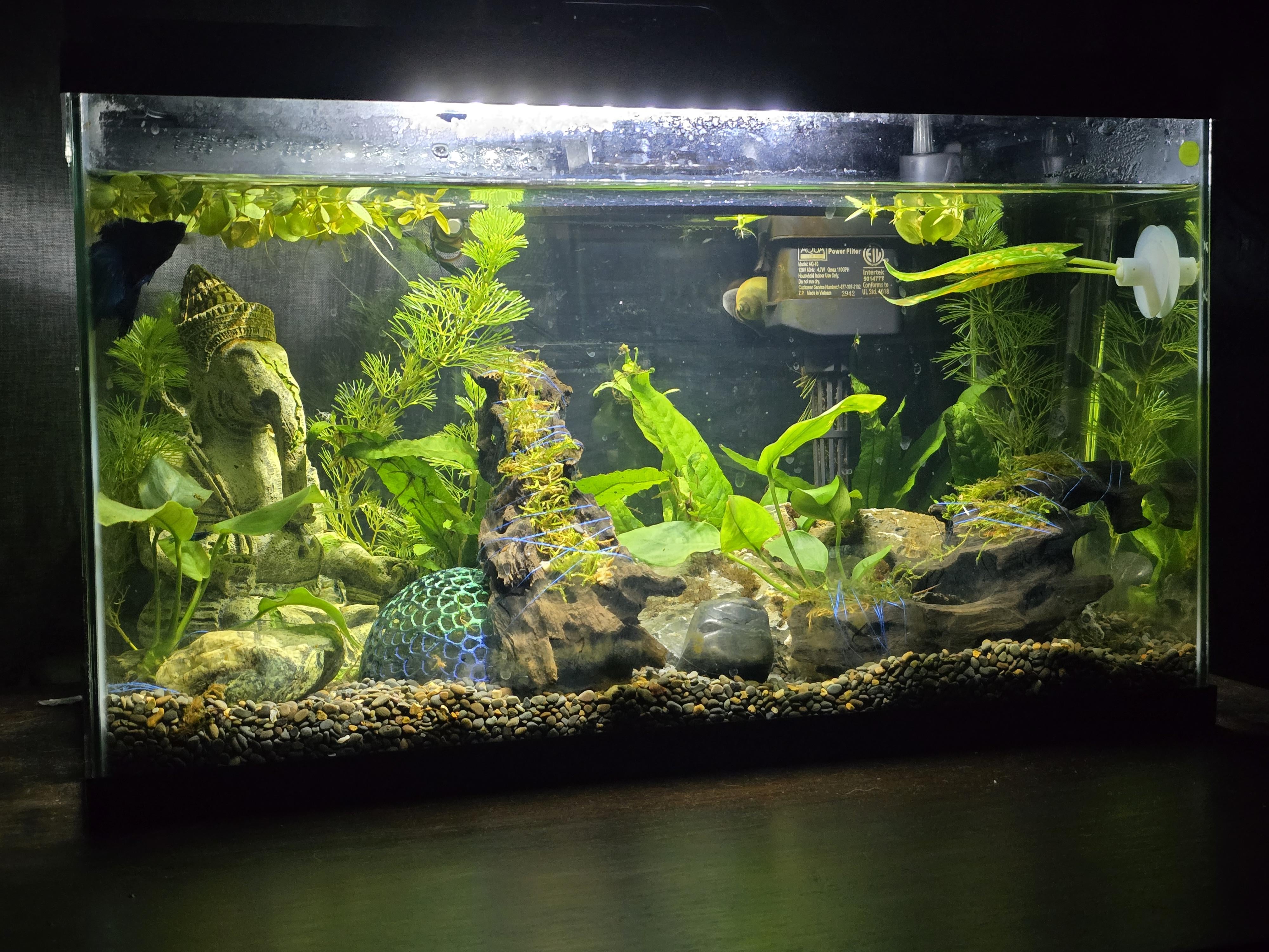 So after my water parameters were finally stable for about a week, I noticed that my betta seemed bored and that he was nibbling at his tail. Ammonia was starting to raise, so I figured I'd do an opportunity to rescape. I acquired the very long stem plants, fire moss, and three more shrimp since he hasn't been aggressive to the two shrimp already in the tank, and got three more blue dream shrimp. After rescaping, replanting and tying down the moss instead of gluing it this time, I think I've reached a point where I really love the aesthetic but I worry if it will be unsustainable.