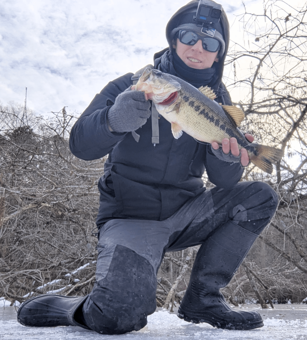 Caught this bass on the first drop through the first hole I drilled, right next to the laydown behind me in a few feet of water. Posted by SlackTideKayakFishin