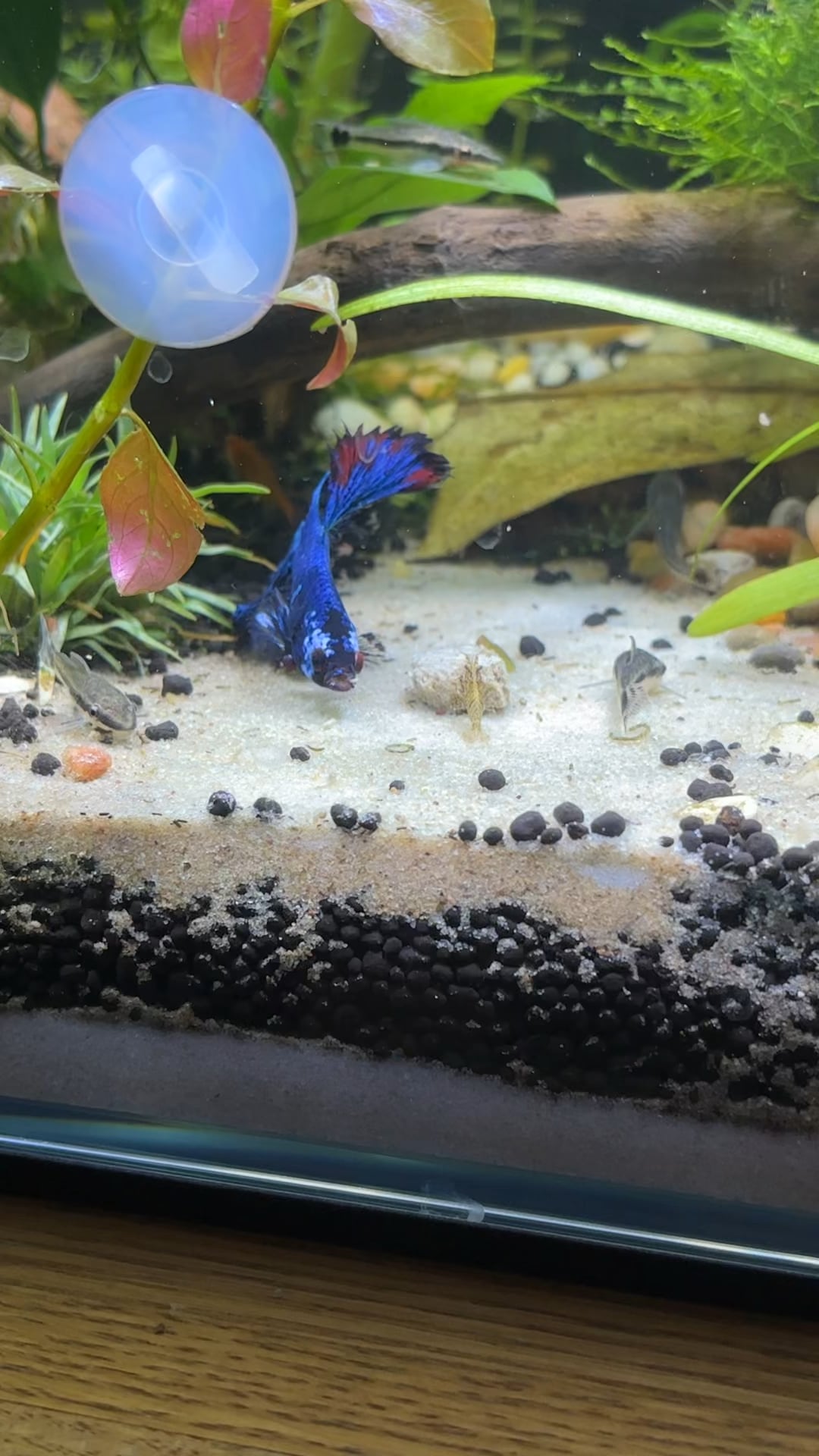 Feeding: once per day fluval bug bites only enough for my betta and embers to consume in a couple minutes, once-twice per week small amount of frozen brine shrimp, once every other day 0.5-1 api algae wafer, occasionally fluval bug bites bottom feeder after lights out for my shrimp