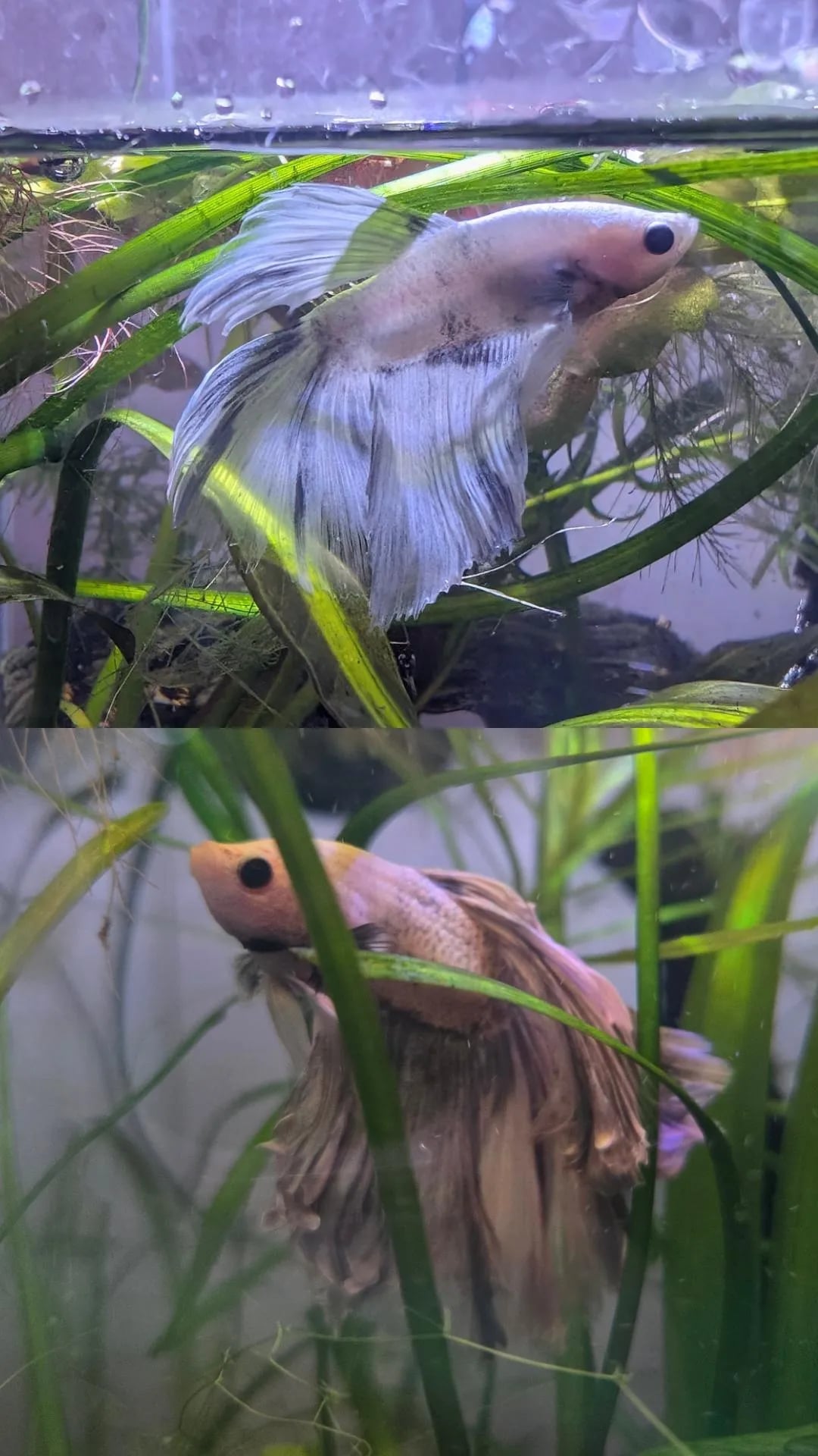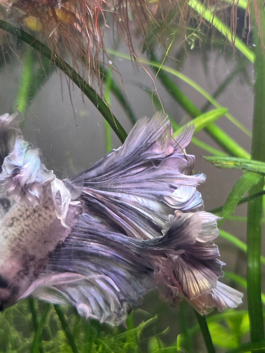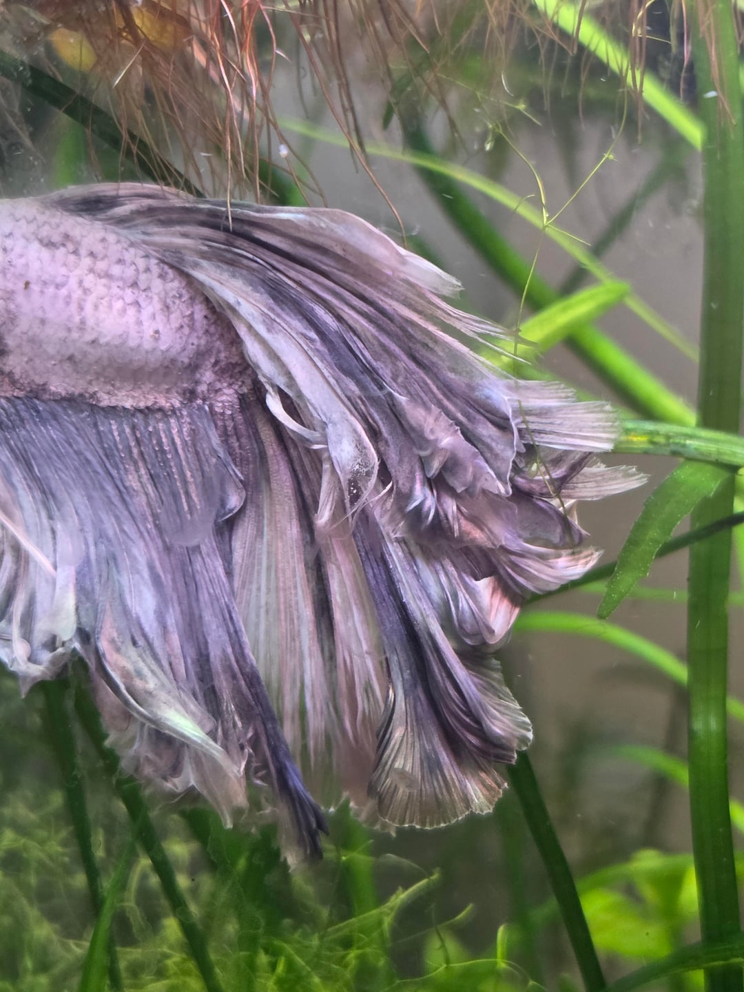 Someone already mentioned bits about rosetails, so im going to mostly repeat that and add a bit to it! Rosetails are the heaviest (and most unethical too) of all tail types due to the extreme branching of fin rays causing them fold over so much, be too heavy to fully open/fish too weak to raise the fin rays, or the rays actually breaking and kinda permanently drooping/folding over. They are unfortunately prone to fin rot and can get damaged easily. The bettas struggle a lot doing anything so a (ideally) shallow tank with *a lot* of resting areas literally everywhere is strongly recommended to try and make life easier for them. Especially as they get into adulthood and continue aging.