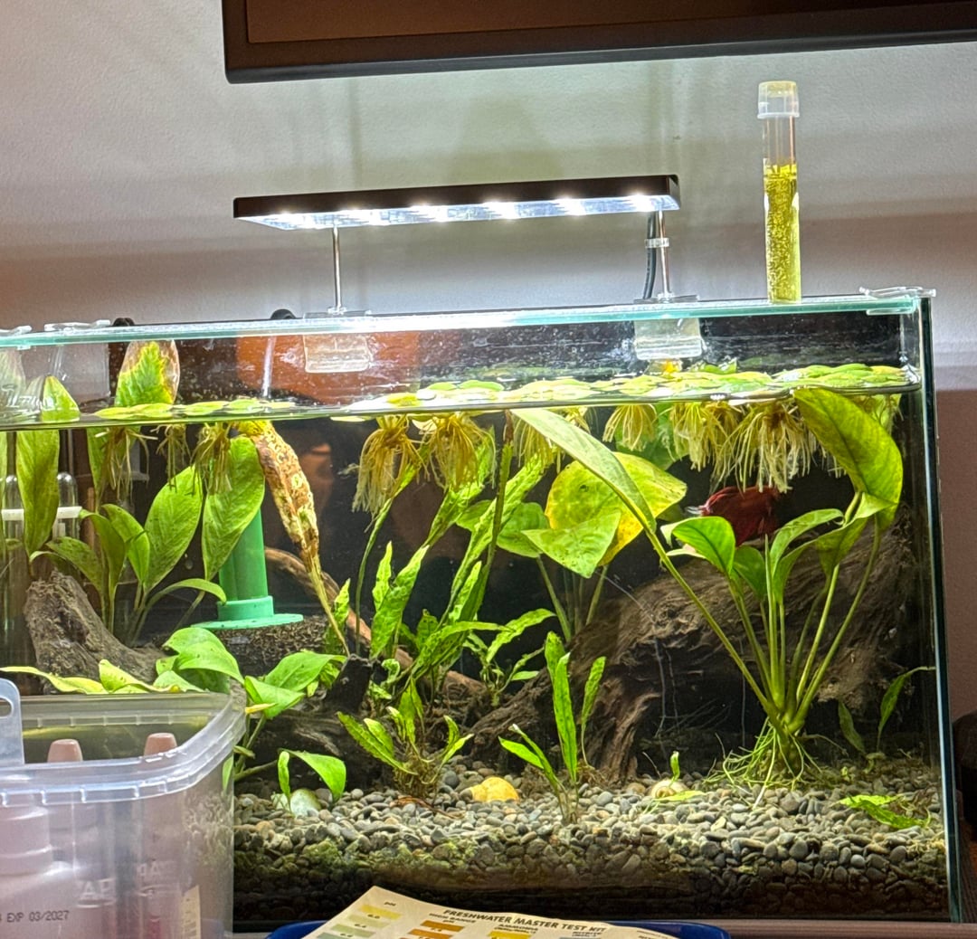 For my small betta tank, I do a 50% water change every Sunday without fail. The plants are almost out of control and I still have some nitrates. I think with your small and non frequent changes, the plants use up all available nutrients and the trace minerals are also not being replaced enough through water changes. I’d also add APT ferts once a week, around 2ml.