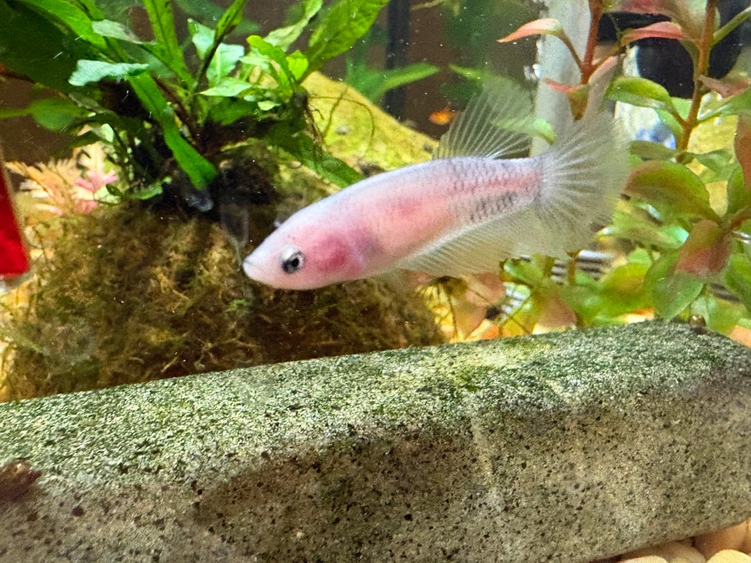 She was sold as a baby and is still very small. I picked her up Friday and she was completely white when I got her. She is in a 10 gallon cycled tank 79 degrees F, tankmates are 2 von Rio flame tetras, 2 harlequin rasboras, 4 ember tetras, and 5 Pygmy Corydoras. There are multiple hiding spots for her. She seems otherwise healthy and spends much of the day exploring nooks and crannies in the tank. She came with the redness in her gill area, ammonia and nitrites are zero.