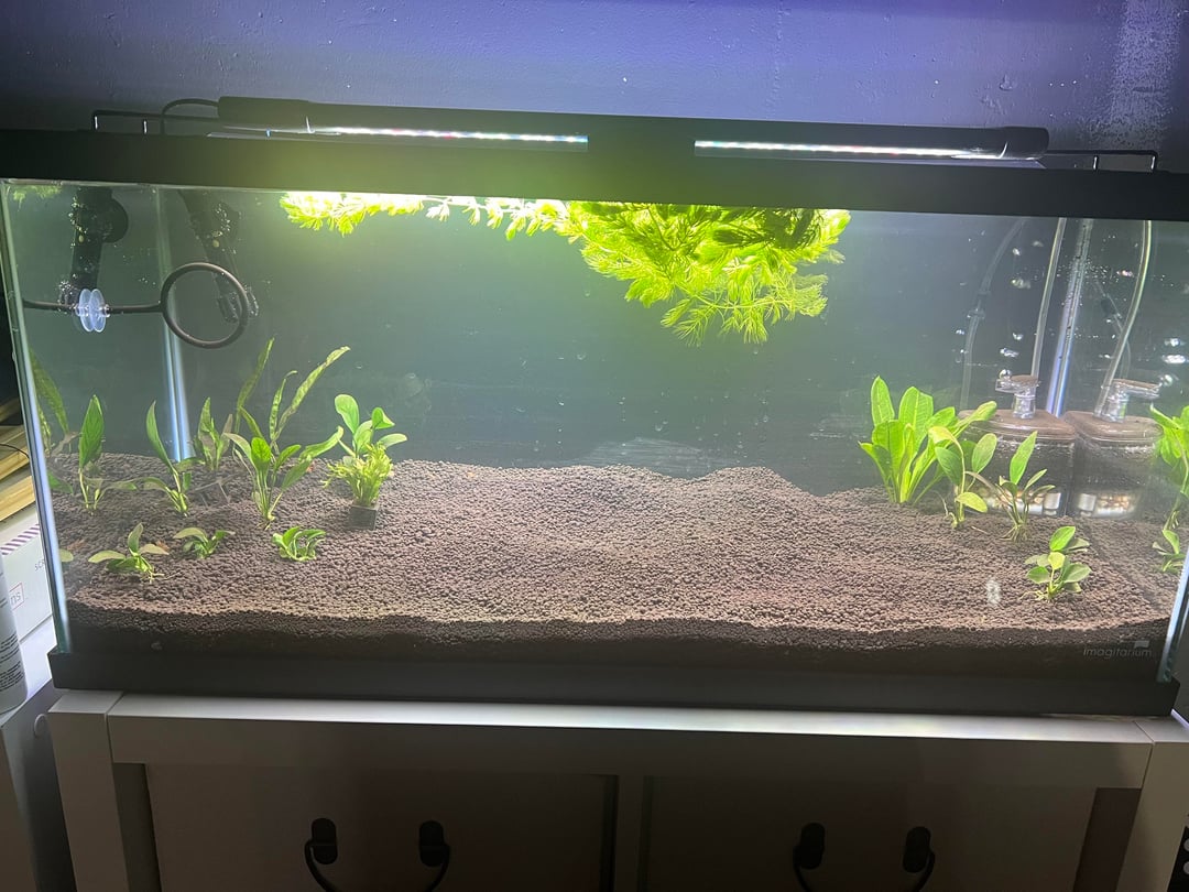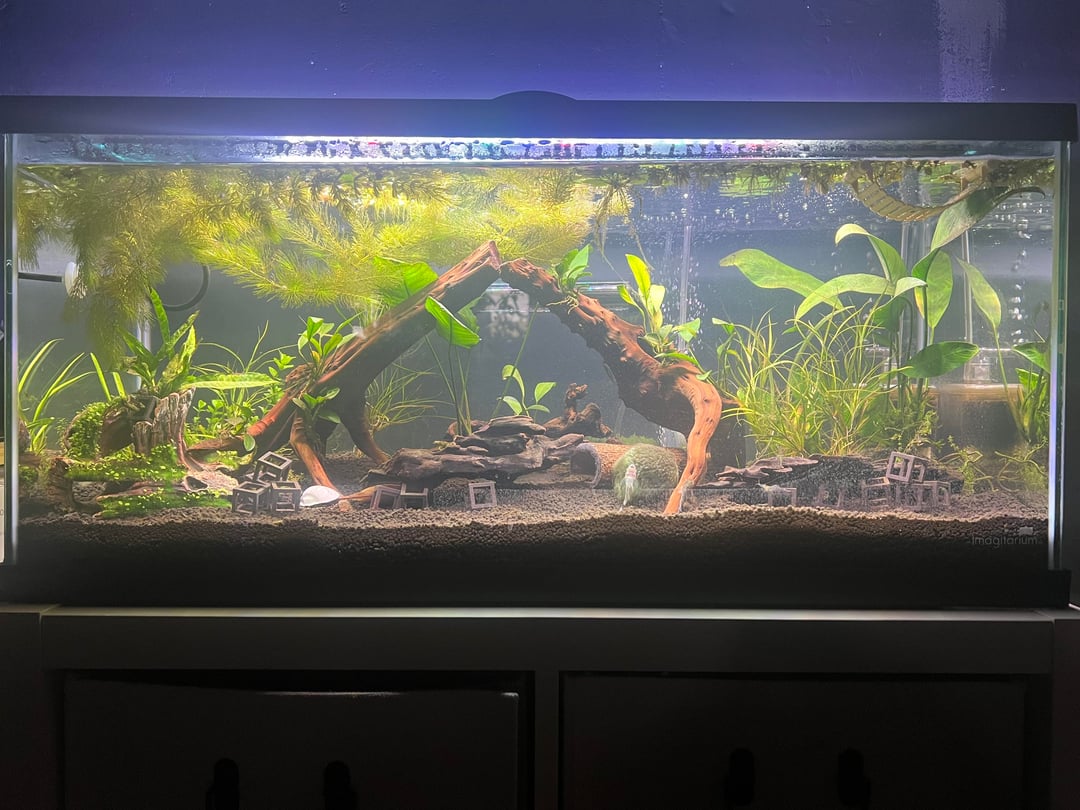 My first planted tank. Any suggestions on what I can adjust? Currently have Amano shrimps, ghost shrimps, and otos. Planning to add one male betta. I think I’ve hit the ugly stage of my tank cycle.