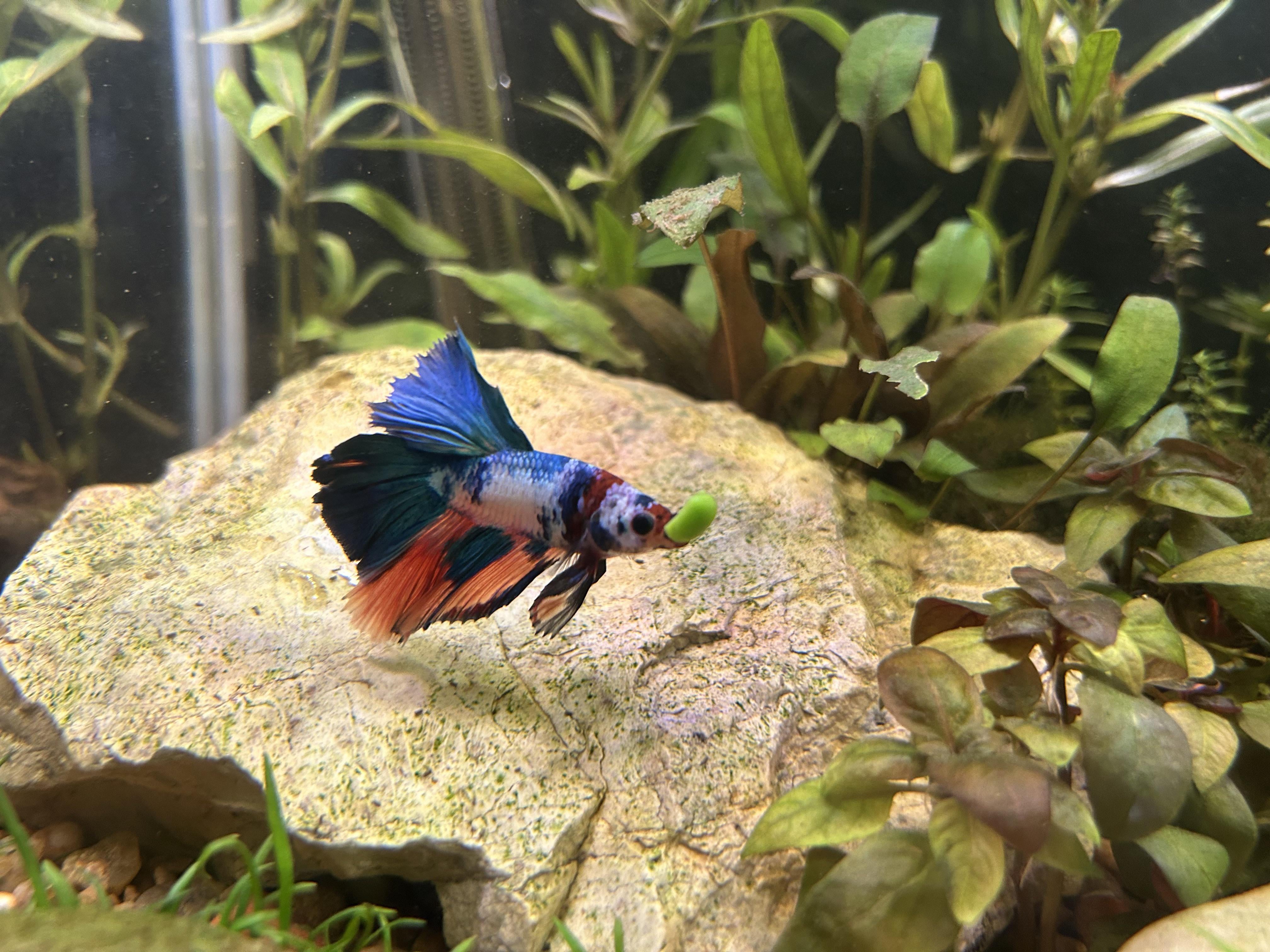 he's picky as hell and spits out his betta food, but the moment i feed the skrimps a pea he's bullying all of them and playing ball with his prize. i did try and feed him a smaller piece but then i heard peas aren't great for betta so i'll just let him wrestle with his oversized chunk