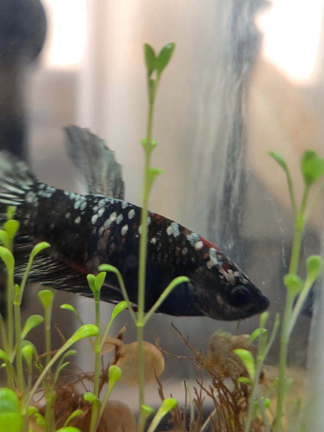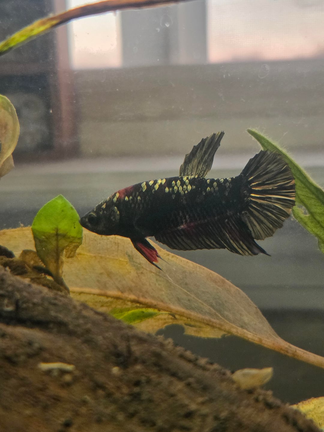 Im so excited! hes been exploring the tank for a bit now, i do have some ghost shrimp in with him, but he doesn't seem to care. he was super curious about them at first, but hes calmed down now and is leaving them alone. i love him so much already!