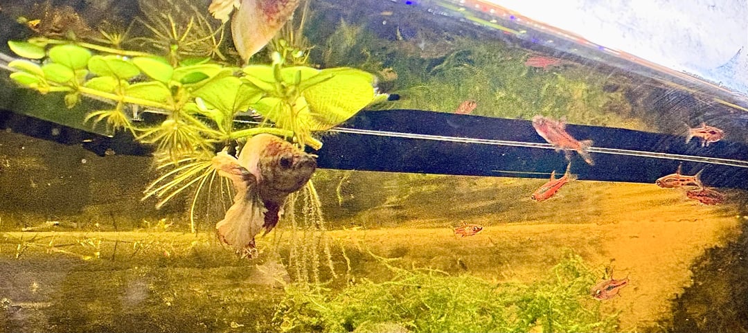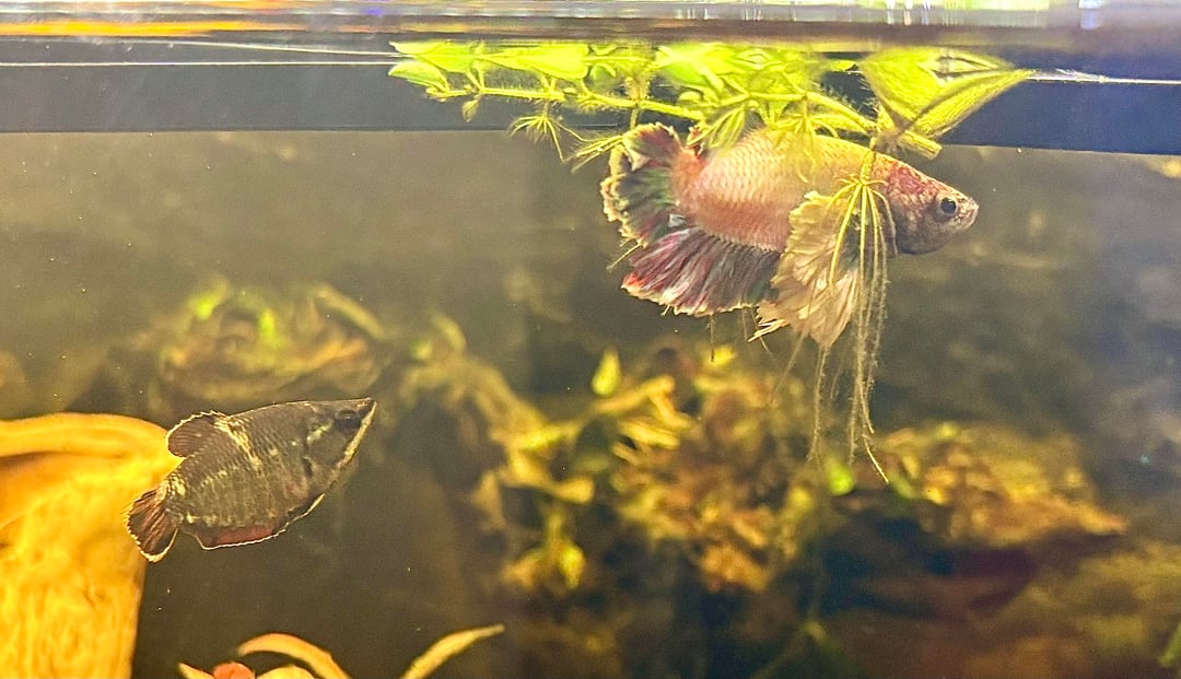 Zen is the perfect community betta, and a most handsome boi. He’s a Rose-Ear Plakat, who loves napping, eating, and peacefully watching his tankmates swim around him. He doesn’t flare or show any of the typical betta anger/aggression (unless one of the smaller fish violates his personal space, then he’ll kind of shoo them away). He’s even very polite to my female Samurai Gourami, Zorya. At most, they kind of give each other the side eye before going their own separate ways, but sometimes I catch them hanging out around each other.