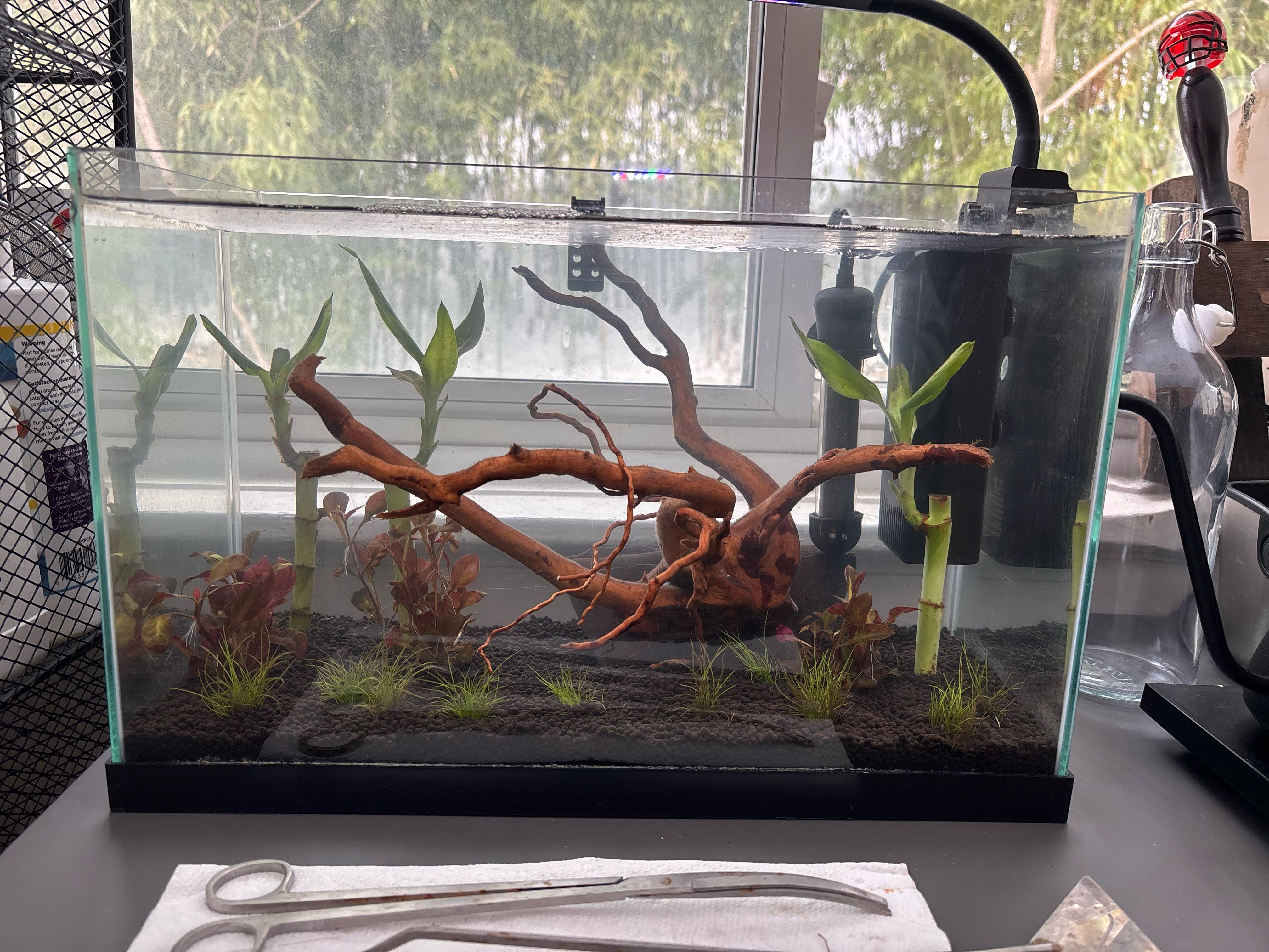 Here’s where my boy Ghibli lives with his roommates Chihiro (mystery snail) and the soot sprites (pygmy corys & otocinclus)