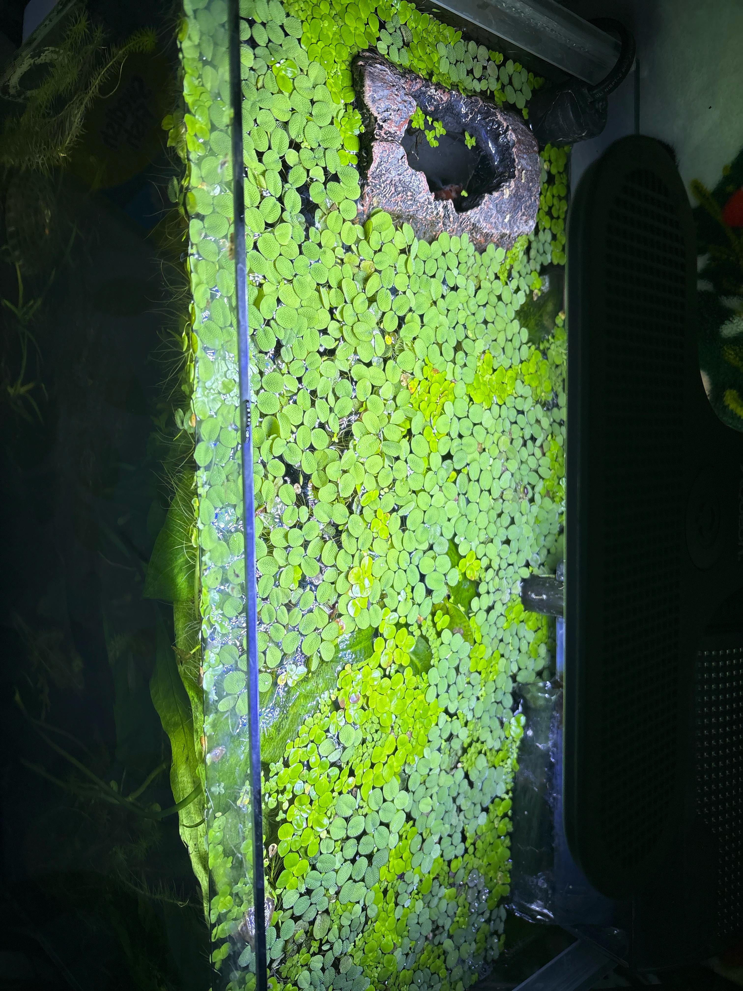 Here’s my one tank as I’ve been experimenting with my duckweed. Top photo is immediately pre-harvest, middle is immediately post-harvest, the bottom is one week later when I harvested again because it came back with a vengeance