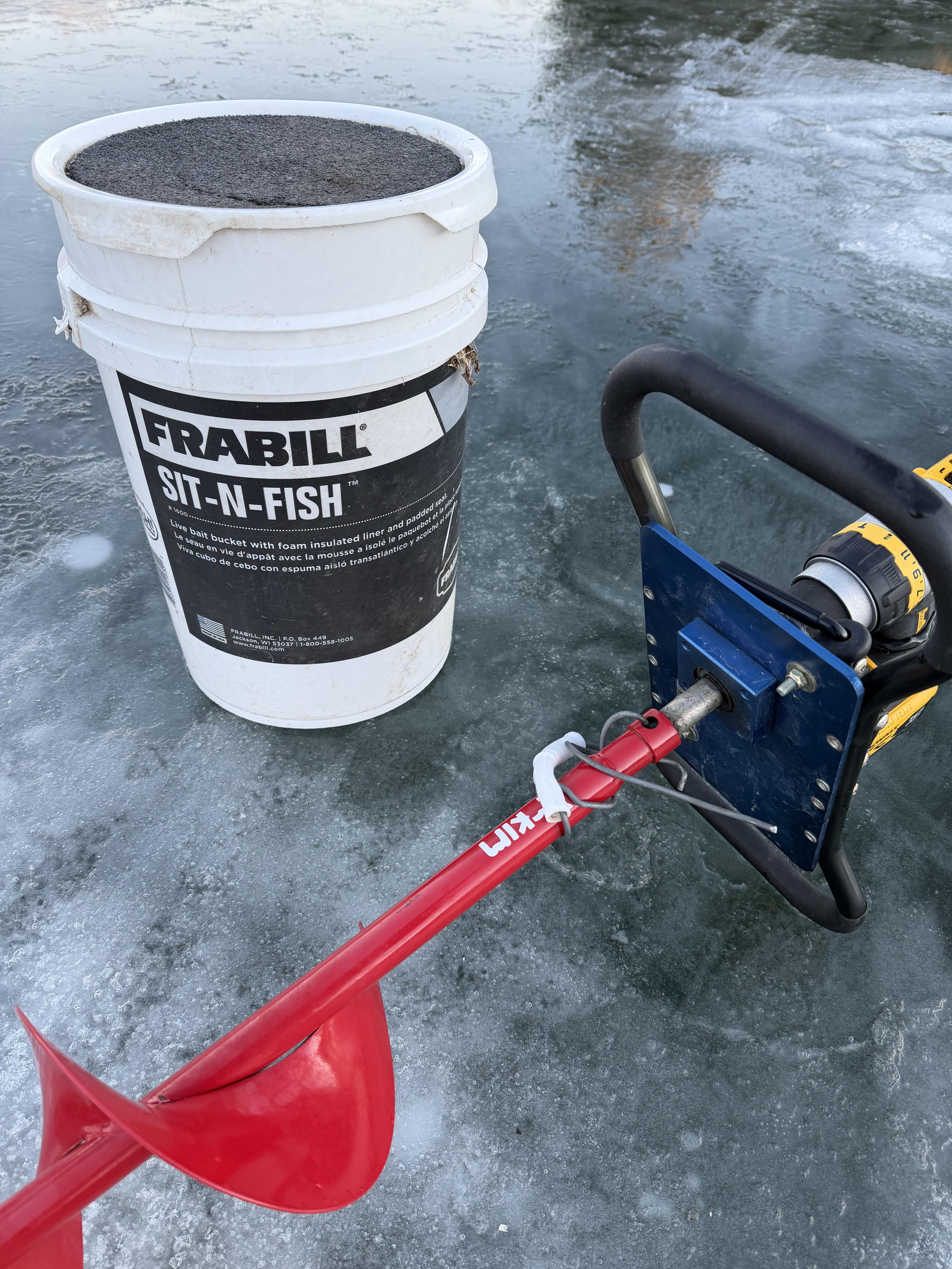10 minutes into ice fishing and only 4 holes drilled, we snapped off our wing nut. Luckily, we were able to take the handle off the Frabill bucket, wrap it around, and continue the day. We were able to drill over 40 more holes. It ain’t stupid if it works!
