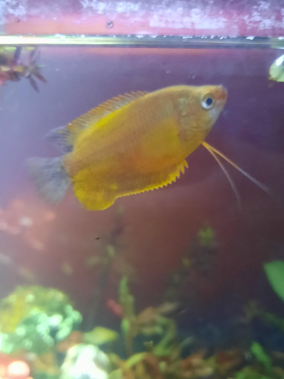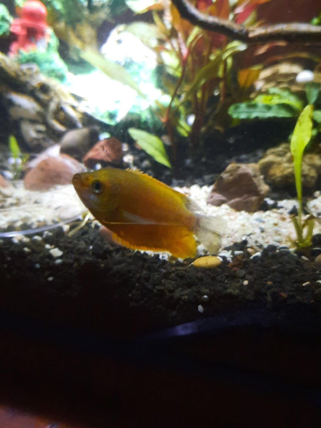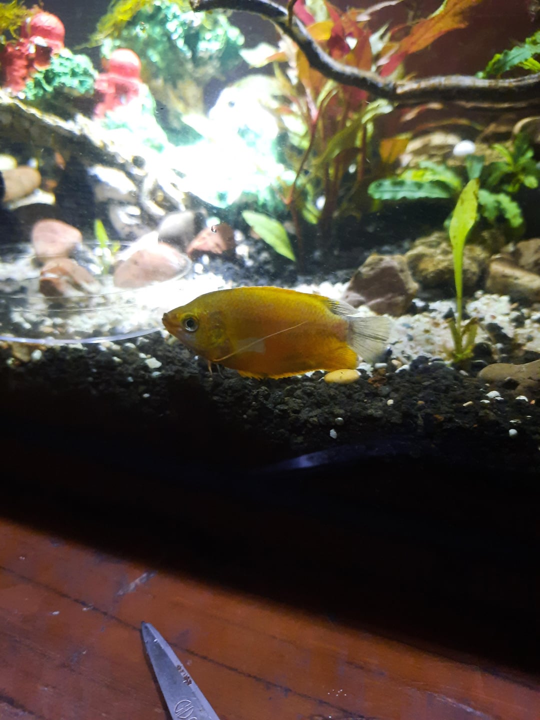 Help, my dumbass bought this guy from lfs and just assumed it's a honey gourami bcs it's yellow.. (I forgot to ask, i went like "oh, this gourami?"). But he's not shy at all and now he's actively swimming & patrolling the whole entire tank, even when he was still inside the bag he's actively swimming around. I need to know is he a honey or not bcs I planned on getting neocaridina shrimps, as friends not a snac
