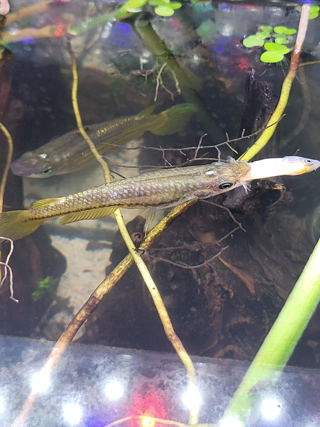 So, I have a lovely pair of golden wonder killifish. Hoping to breed them, they've shown interest in each other but no results but thats neither here nor there. I went to the lfs today to pick up some ghost shrimp to fill my tanks as feeders. I also decided I'd buy some Rosie reds to throw in this tank for a little extra life since its mostly empty aside from the GWs, a pleco and a catfish. Normally a few die bc they come as feeder with genetic deformities. Well they didn't even have a chance to die from that. I caught the male with one halfway in his mouth alive that I saved. I caught the female with one and it was already gone but way too large for her to eat surely so i got it away from her and pushed it in the catfish cave. Now she's gone and grabbed another one but its sadly gone too. They just seem way to large to logically be getting eaten here. Theyre half the size of the GWs. Is it safe to let her just digest this so she stops murking them? I fed them twice today (only bc I was adding fish) and she's still munching🤦♂️Or is there a chance she like chokes and drowns or something. Ik that sounds dumb but she's very clearly stuck at the dorsal fin