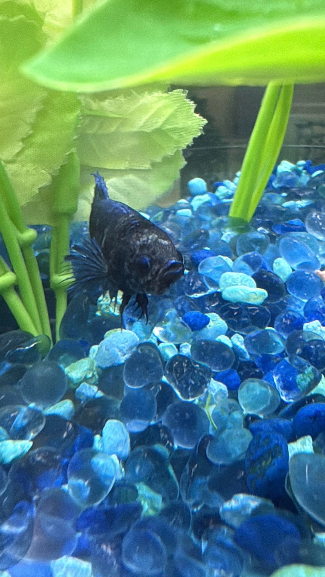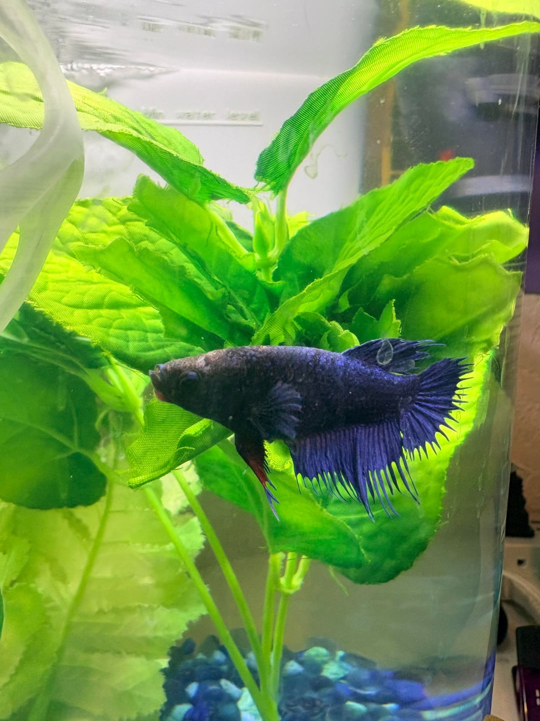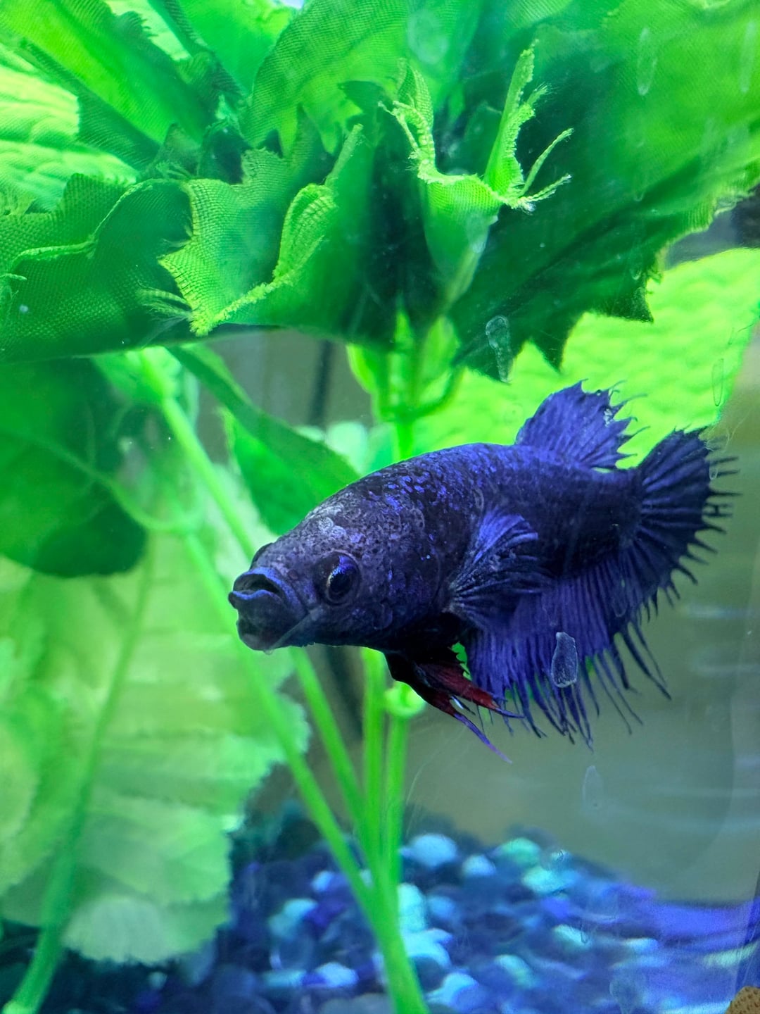 Hi there. A couple of days ago I noticed a reddish bump and some whiteness on our sweet Iris’s chin and head. I did some research and believe it could be a fungal infection from a water quality issue. My daughter gave her way too many bloodworms last week and part of what I found online was that they can contribute to high ammonia levels in her tank. I cleaned out a little over 50% of her water and began treating her with Imagitarium Betta Remedy. She hasn’t acted differently in any way, still seems to be as active and otherwise normal.